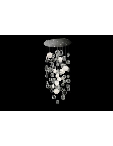 E' una danza luminosa quella che la lampada a soffitto Hanami, disegnata dal marchio di illuminazioni di lusso Barovier&Toso, crea nell'ambiente attraverso una cascata in vetro di Murano.Hanami è infatti composta da bolle in vetro soffiato collegate da cavi di diverse dimensioni che scendono elegantemente verso il basso creando composizioni dal fascino irreale. Le bolle in cristallo trasparente o tinto nei colori acquamare, verde o grigio sono alternate a bolle bianche opache e illuminate dall'interno da faretti LED che, insieme a quelli incassati nella piastra a soffitto in metallo cromato, si riflettono sulle superifici in vetro restituendo giochi di luce unici e suggestivi. Hanami è realizzata in cinque modelli che differisco per grandezza e numero di cavi.