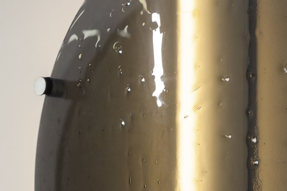 Questa lampada, progettata dai designer dello Studio Pepe, si presenta come un complemento d'arredo che non passa inosservato: una struttura in metallo verniciato bianco sostiene, attraverso perni d'aggancio in ottone brunito opaco, un paralume circolare in vetro-fusione lavorato con una particolare tecnica per renderne irregolare la superficie. L'applique Nanda è dotata di sorgente luminosa neon di color bianco ed è dimmerabile.