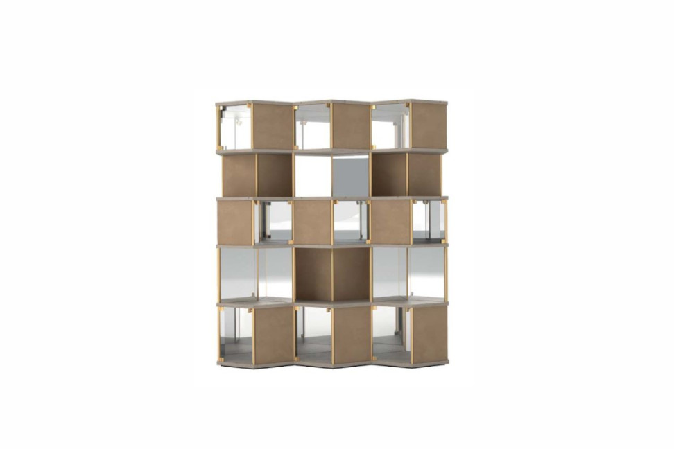 Caratteristiche Tecniche: Ripiani in acero. Antine in vetro fumé extra chiaro con dettagli in ottone satinato o ottone brunito. Spalle e divisori in MDF e laminato rivestiti in pelle e in specchio; piedini regolabili.