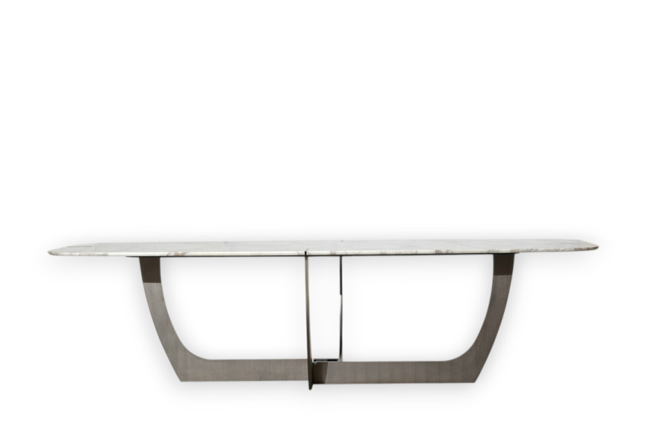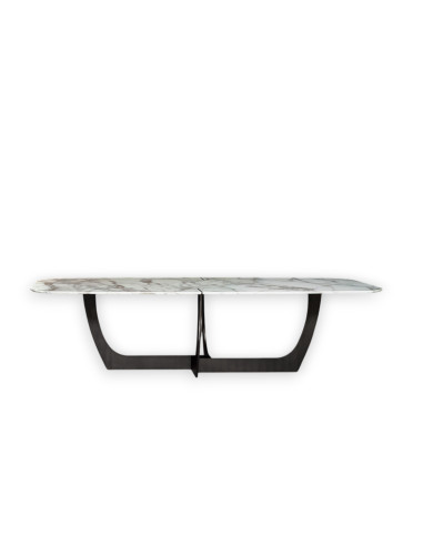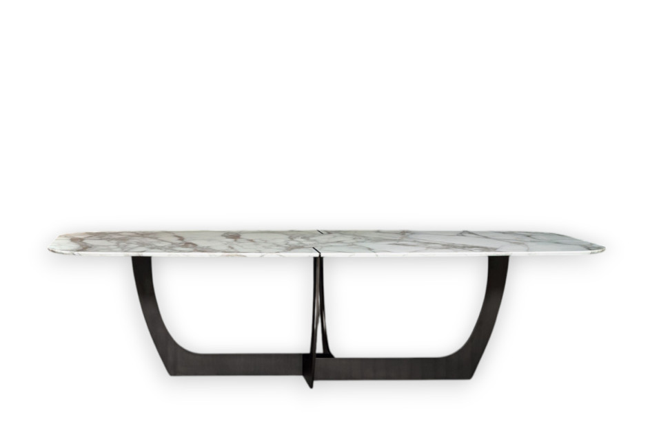 Romeo di Baxter è un tavolo fisso prodotto con una base in metallo brunito spazzolato e un piano in marmo Calacatta Oro o rivestito in cuoio. È disponibile in varie dimensioni.