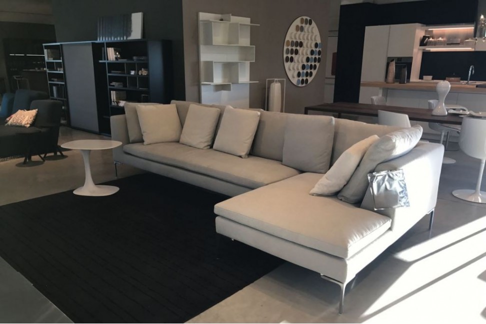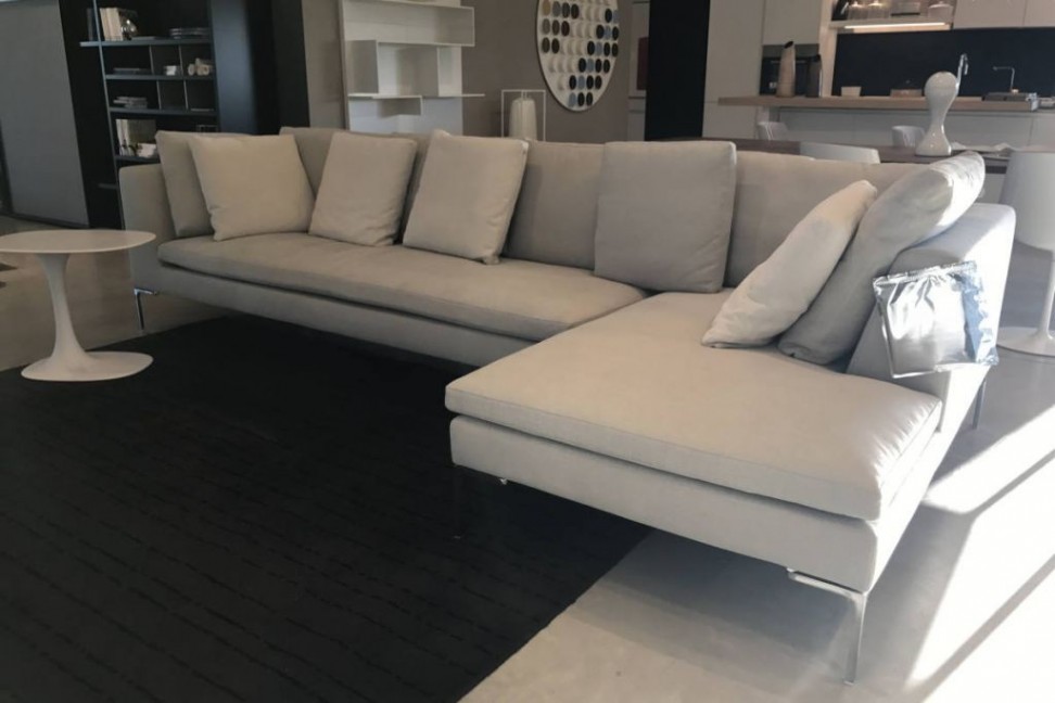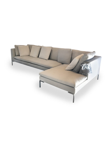 Il divano Charles, in esposizione nel nostro showroom, è composto da un elemento terminale destro e una chaise longue. Una composizione lineare, che può trovare posto anche al centro del più contemporaneo ambiente living. Charles è dotato di un rivestimento sfoderabile in tessuto. La presenza di cuscini schienale rende questo divano un'accogliente penisola di relax.