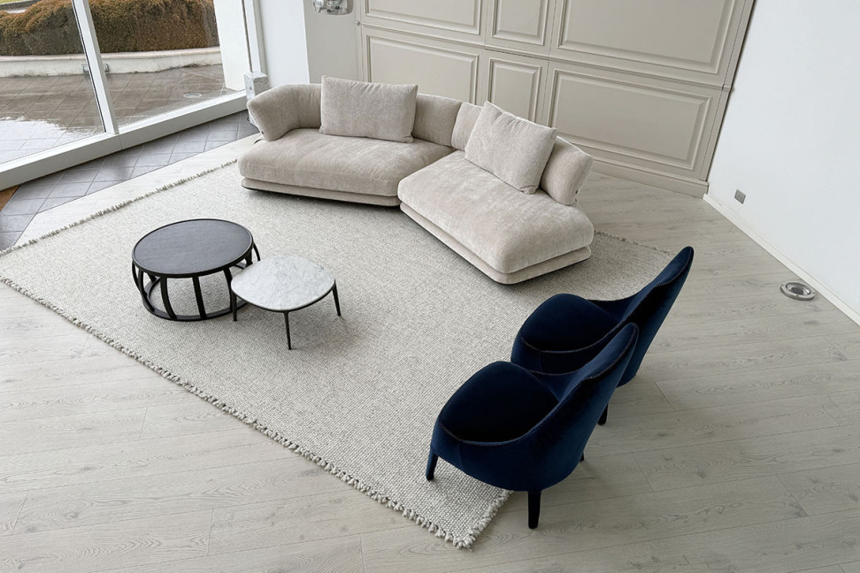 Il divano Cocùn di Antonio Citterio per B&B Italia, nella composizione proposta presenta un terminale sinistro, un terminale/pouf e due cuscini schienale. La struttura è costruita su una base imbottita che funge da vero piano di appoggio per i moduli. Gli schienali, fissati alla base tramite staffe rivestite in tessuto, possono essere posizionati in modo da definire diverse zone di appoggio, rendendo il divano utilizzabile sia frontalmente che in modo più informale. Il bordo in alluminio percorre il perimetro della base e ne definisce il disegno, mentre i cuscini di seduta e schienale, ampi e morbidi, sono pensati per un utilizzo prolungato e rilassato. Il divano Cocùn nasce dall’idea di un divano vissuto, pensato per il tempo libero e la condivisione, più simile a un insieme di sedute che a un divano tradizionale con posti fissi.