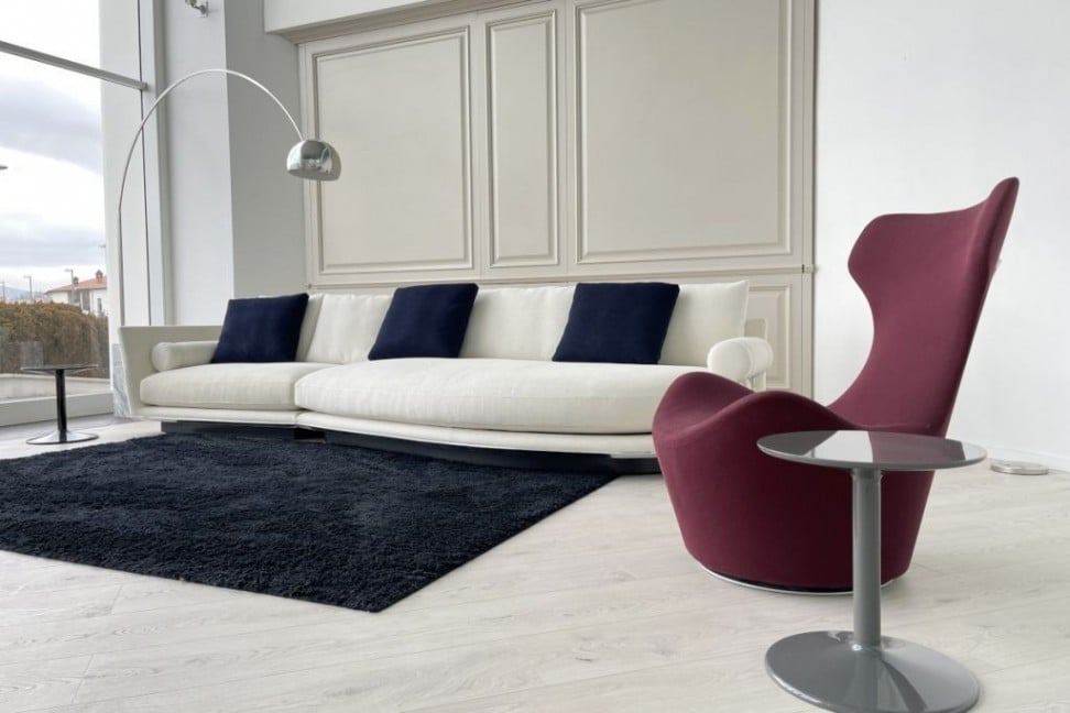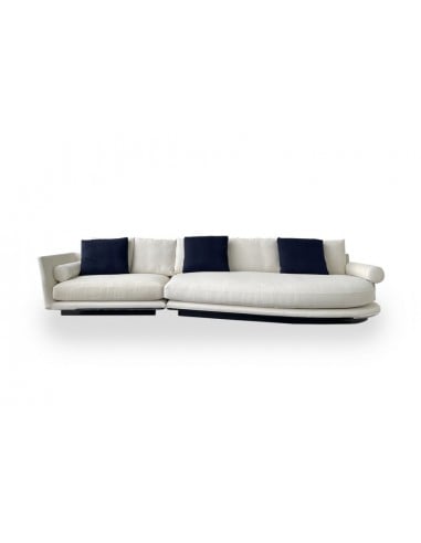 Il divano Noonu in offerta expo nel nostro showroom è composto da un modulo terminale e da un'ampia penisola; è rivestito in tessuto di color bianco sporco, reso ancora più elegante dai tre cuscini in colore blu notte. Il tutto è rifinito da un basamento con profilo metallico in alluminio spazzolato.