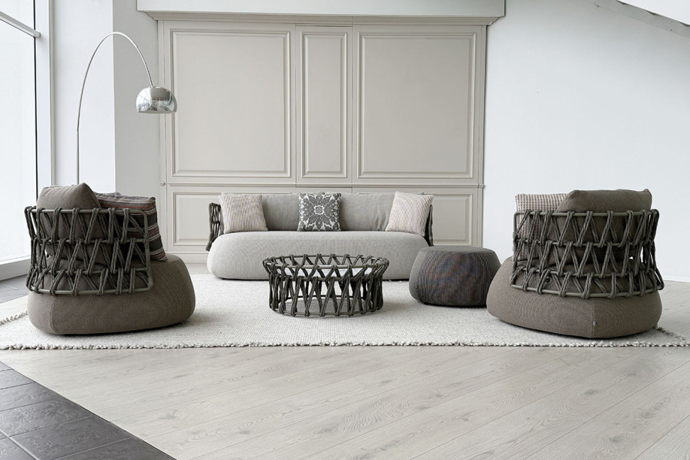 Il divano Fat-Sofa Outdoor, disegnato da Patricia Urquiola per B&B Italia Outdoor, porta all'aperto una silhouette di seduta già consolidata nel catalogo del brand. Le linee curve e piene della versione da interni ricalcano fedelmente il modello originale, senza rinunce che ne alterino il carattere. A cambiare è il rapporto con lo spazio circostante: gli intrecci dello schienale, realizzati a mano, introducono una sensazione di leggerezza e un tocco artigianale che si integra perfettamente agli spazi esterni. Non si tratta di un semplice dettaglio estetico, ma di una soluzione di design studiata appositamente per gli allestimenti open air.