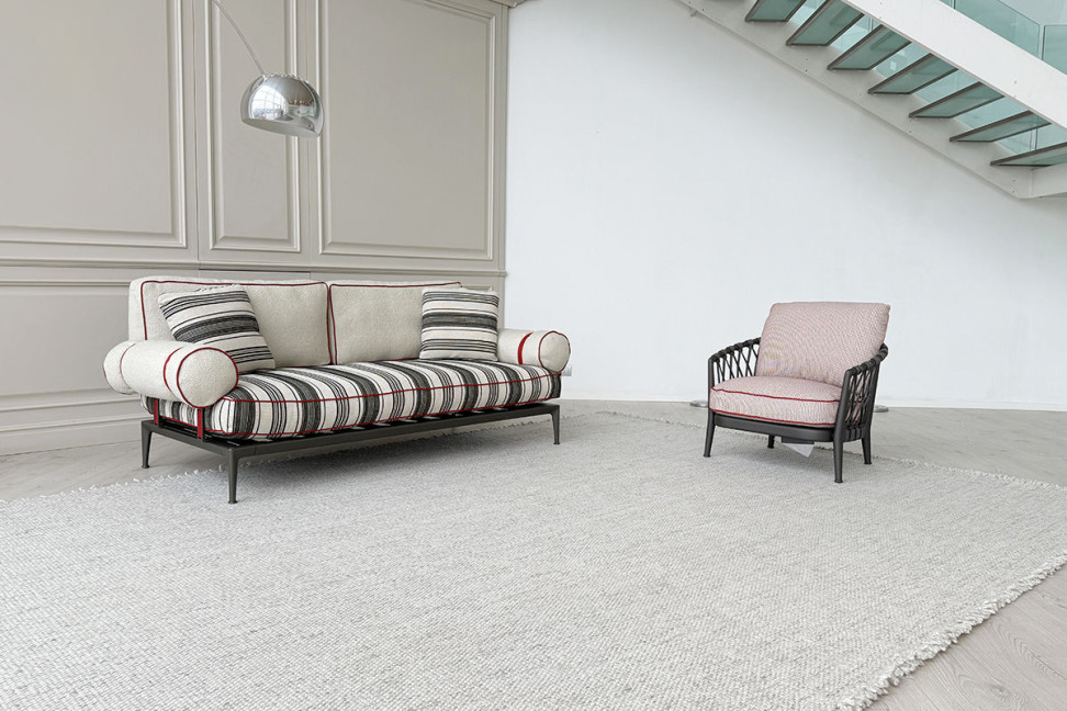 Divano outdoor con struttura in alluminio verniciato antracite e intreccio in fibra di polipropilene antracite. Cuscini in tessuto a strisce nero e beige. Profili a contrasto in corda di colore rosso. Braccioli a rullo con supporto metallico.