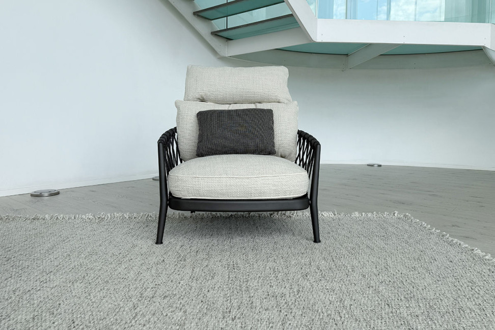 Poltrona da giardino con schienale alto. Struttura in alluminio color antracite. Intreccio in polipropilene tono su tono. Cuscini seduta e schienale in tessuto color bianco sporco a trama grossa. Cuscino lombare in tessuto grigio con tratteggio bianco sporco.