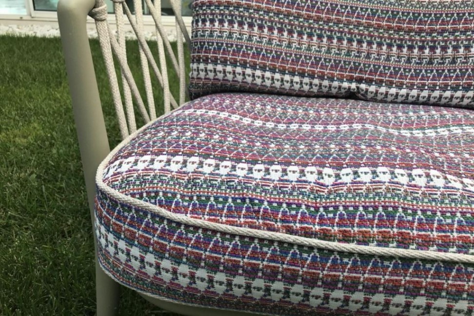 Cuscino seduta e cuscino schienale rivestiti in tessuto a fantasia con profili color naturale, struttura in metallo verniciato color salvia con intreccio in polipropilene color naturale.