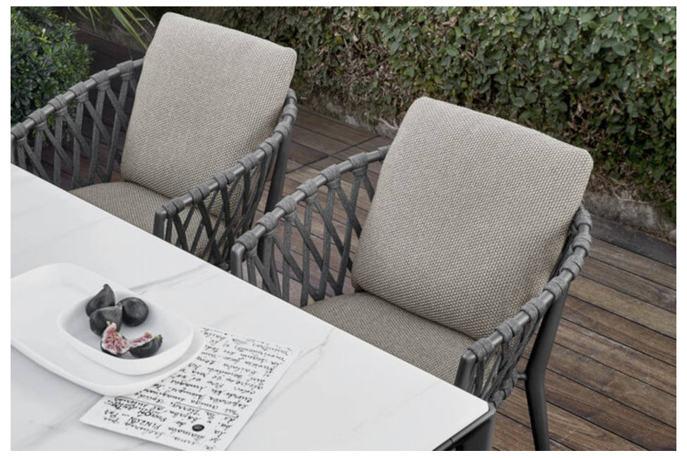 Per assicurare un comfort ottimale, la sedia per esterno Erica è dotata di cuscini per il sedile. Questi cuscini non solo aggiungono un tocco di accoglienza e calore visivo, ma offrono anche un sostegno comodo e invitante, ideale per momenti di relax all'aperto.