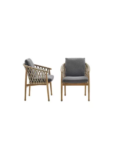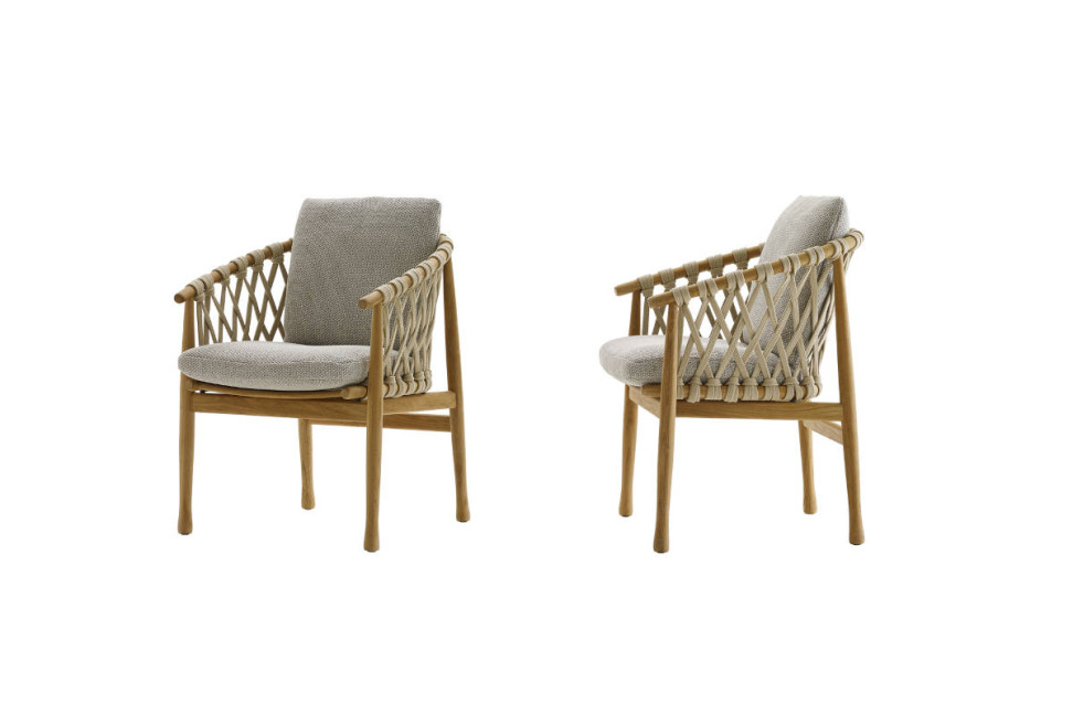 La sedia per esterno Ginestra è caratterizzata da linee morbide e avvolgenti, la struttura è realizzata in teak naturale mentre lo schienale è ottenuto intrecciando nastri in fibra di polipropilene. La sedia è arricchita da morbidi cuscini imbottiti.