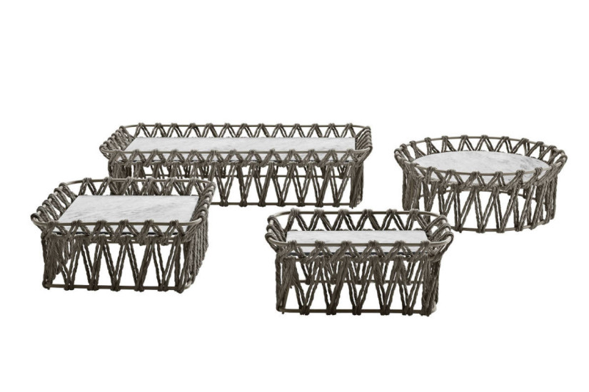 Il tavolino Butterfly è caratterizzato da un originale intreccio grafico realizzato con fibre di polietilene ritorte color tortora, che avvolge l'intera struttura in alluminio verniciato grigio.