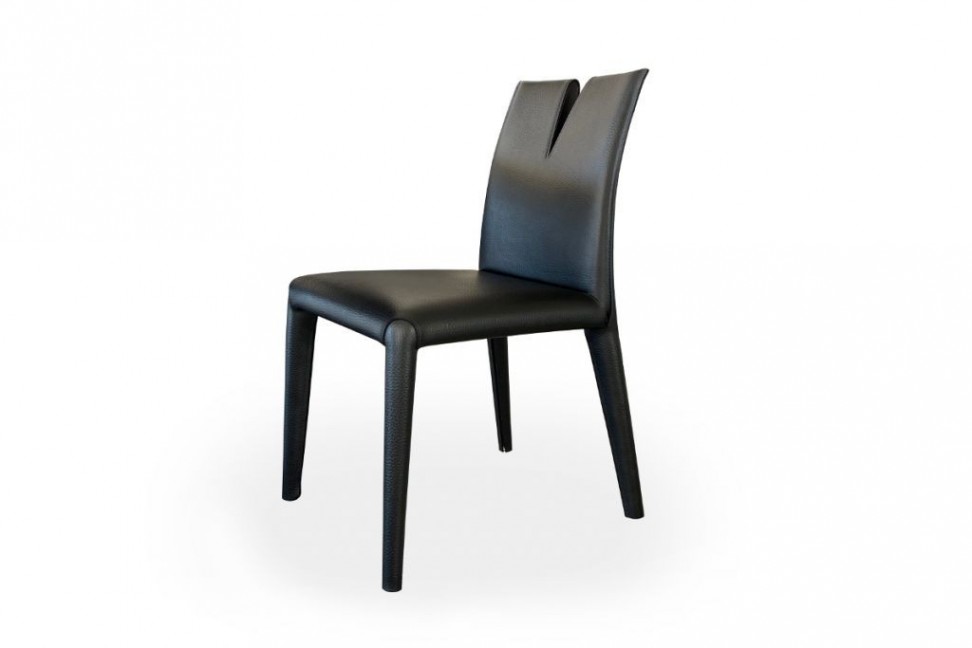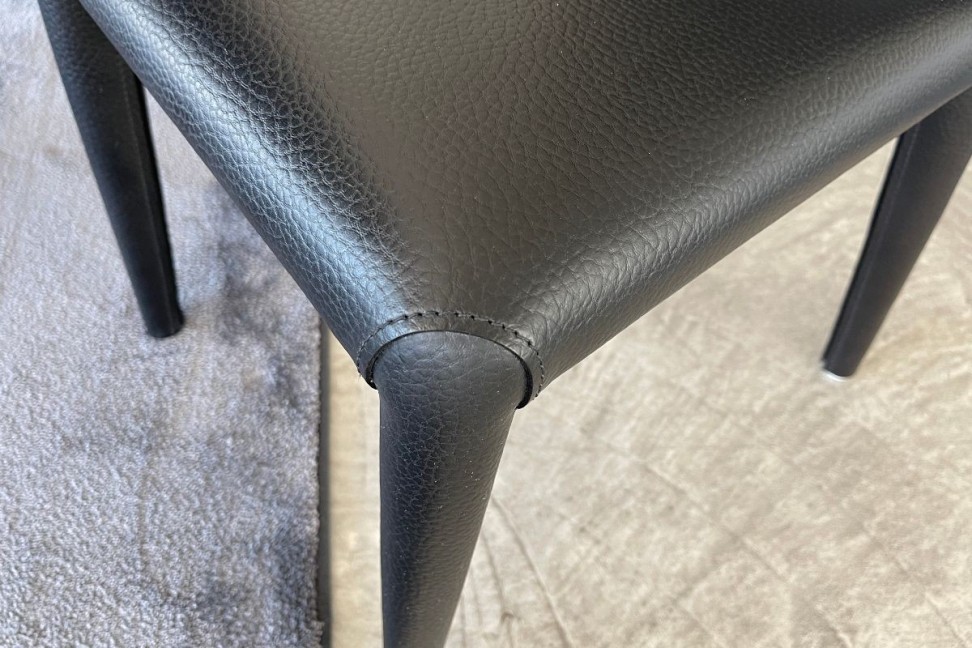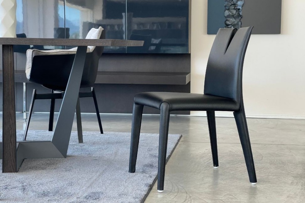 La sedia Cutter in Offerta Expo nel nostro showroom presenta un rivestimento in cuoio con grana nero, mentre la parte interna del taglio sullo schienale è rivestita in cuoio nero.