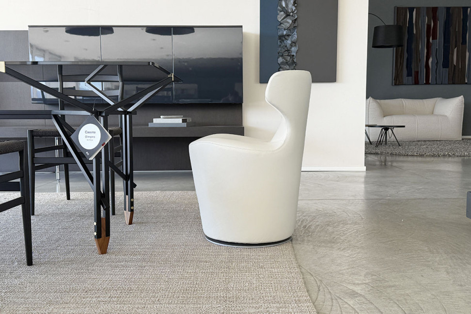 La sedia Mini Papilio in offerta Expo nel nostro showroom presenta un rivestimento in pelle color bianco gesso e una base girevole.