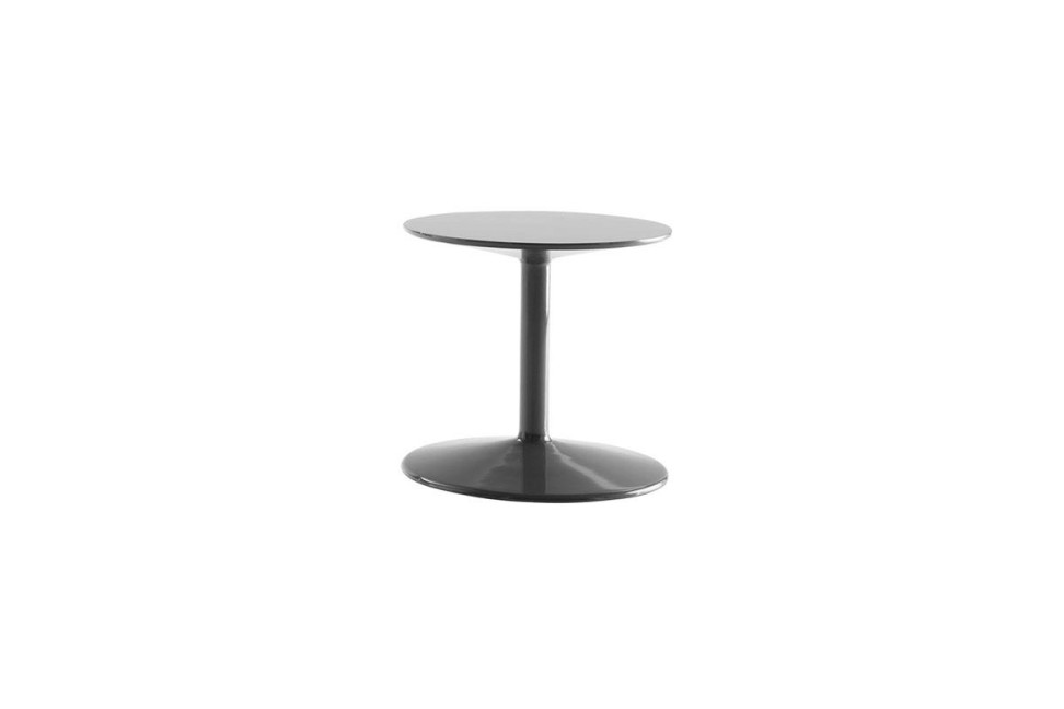 Tavolino in poliuretano rigido stampato e verniciato color grigio acciaio lucido.