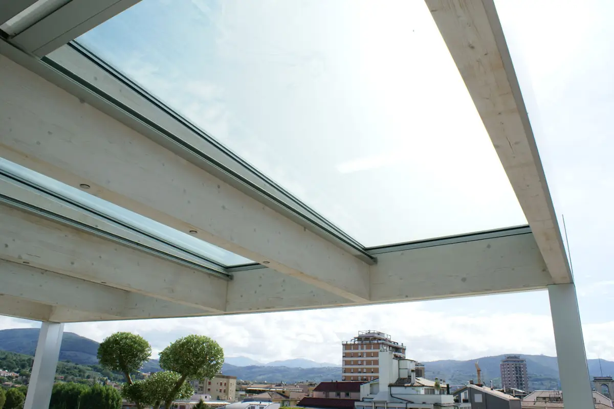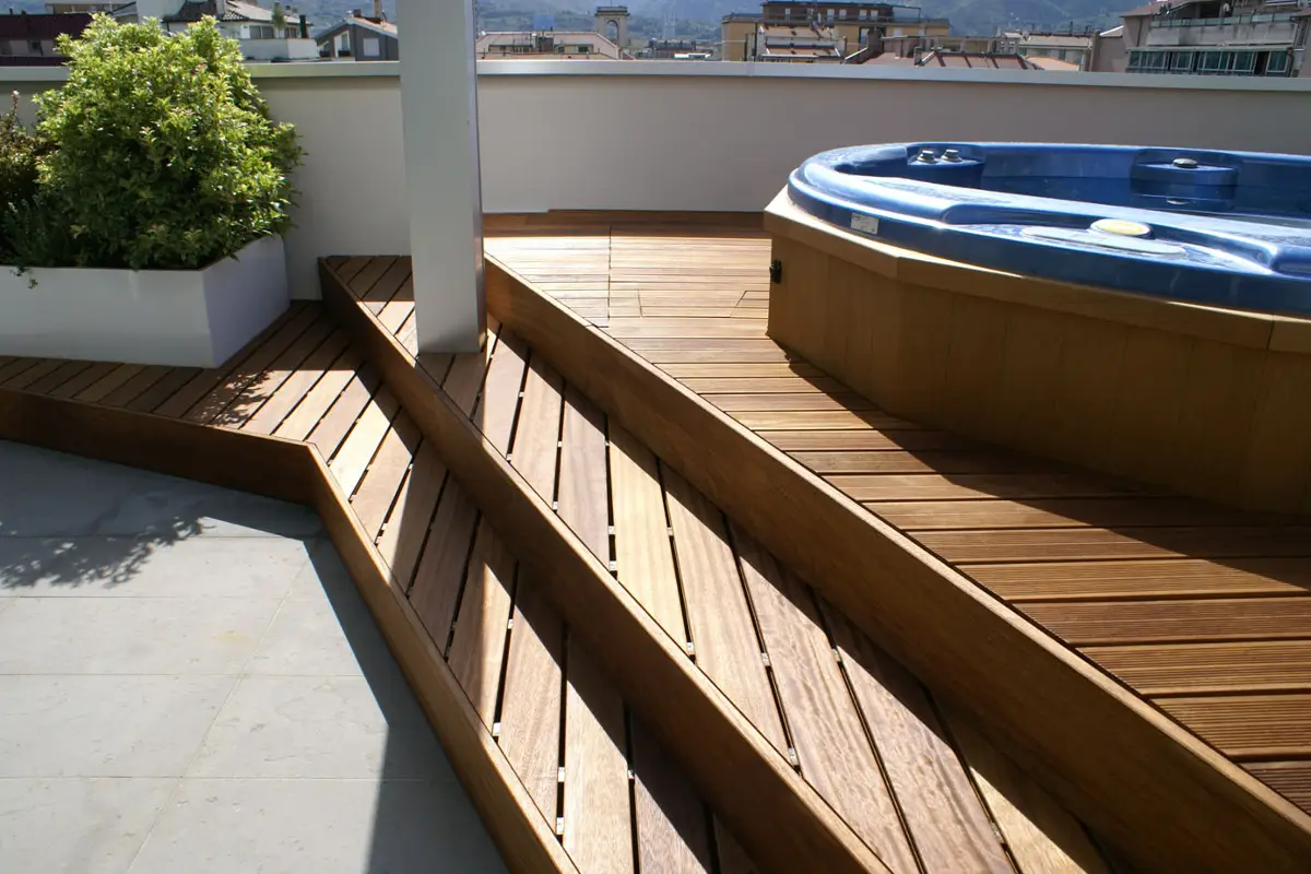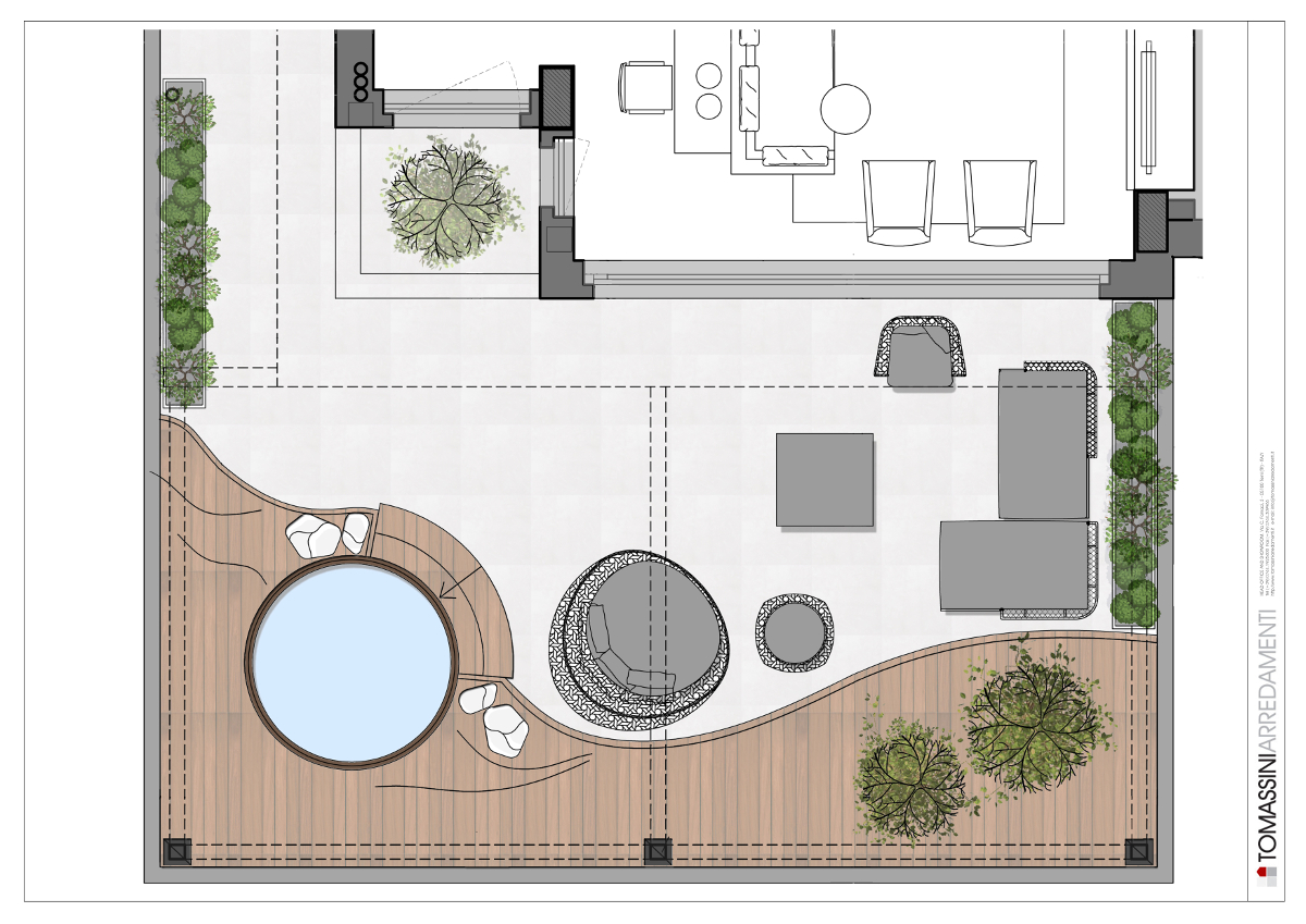 Il basamento in legno corre lungo il perimetro del terrazzo seguendo una forma fluida e dinamica, questa leggera differenza di altezza permette di avere una pedana su cui vengono ospitati i vasi e la vasca idromassaggio. L'ombra è garantita da una pergola in legno, metallo e vetro, con schermature scorrevoli in copertura per garantire luce in inverno e ombra in estate.