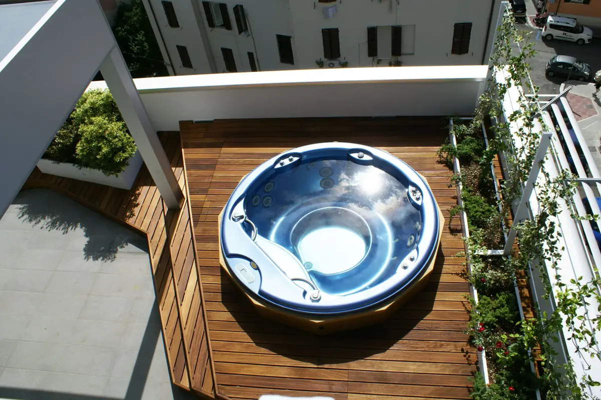 Il terrazzo è stato concepito esattamente come un vero e proprio living “en plein air”. Lo spazio è suddiviso in funzioni: un’area per il relax con divani e poltrone che si ispirano allo stile delle collezioni di Roda, la vasca idromassaggio rialzata, e la zona pranzo attrezzata con tavolo e sedie, posta in un angolo più riparato.