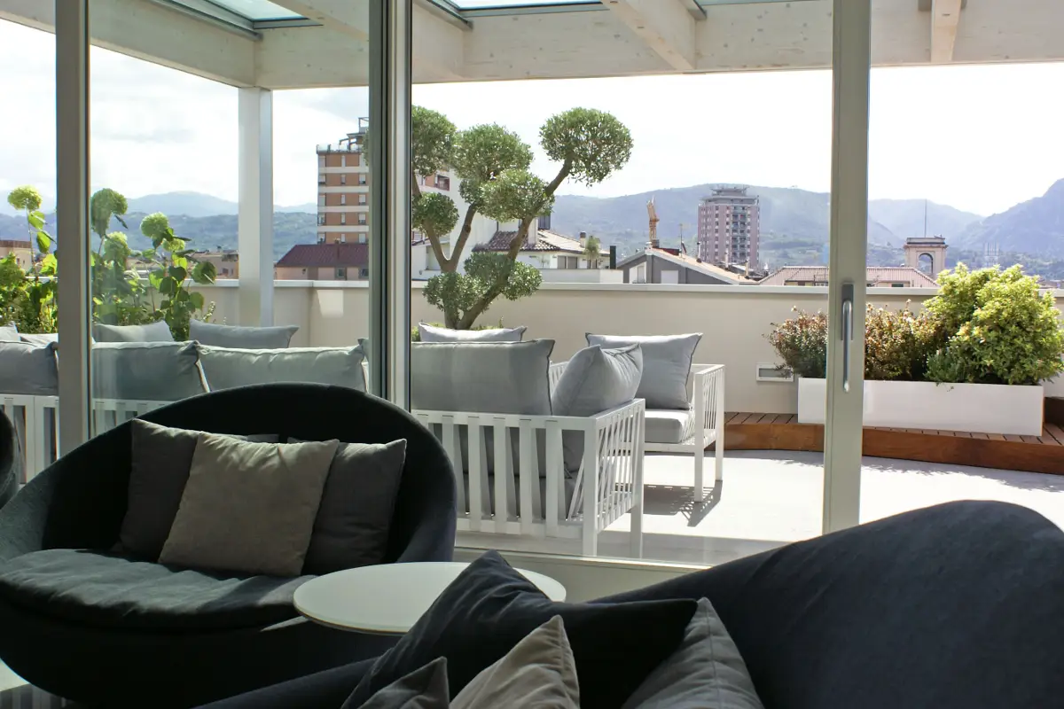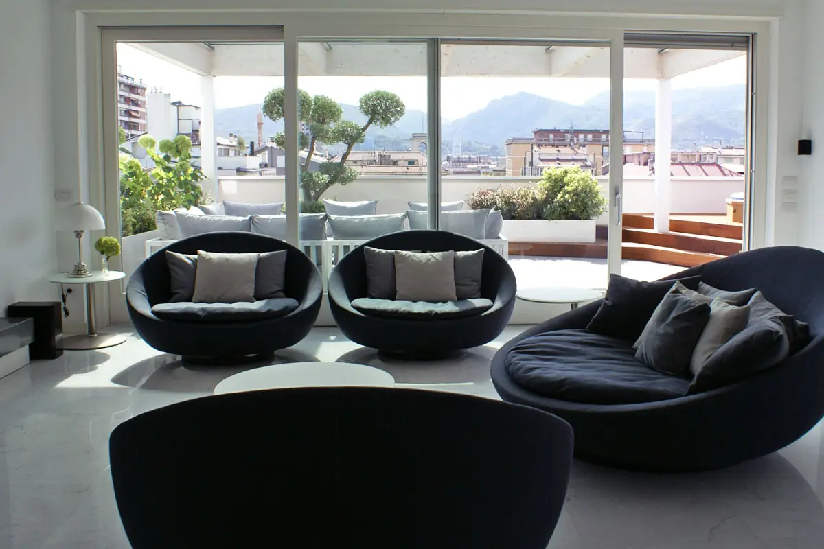 La bellezza di questo attico è data soprattutto dalla luce naturale che pervade tutti gli spazi creando un'atmosfera accogliente e piena di vita. Le grandi vetrate scorrevoli mettono in diretta comunicazione gli spazi facendo diventare il terrazzo il prolungamento della zona living.