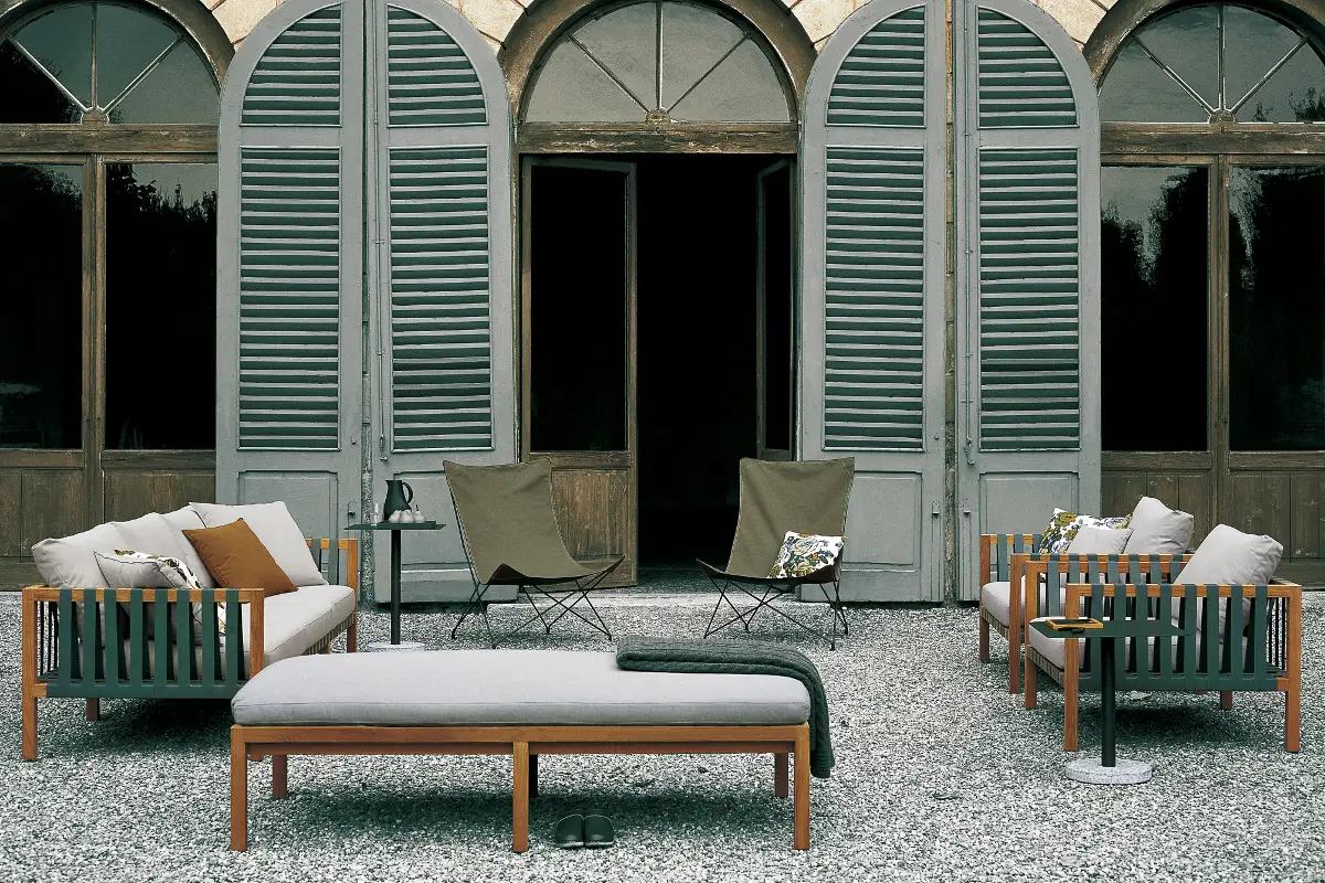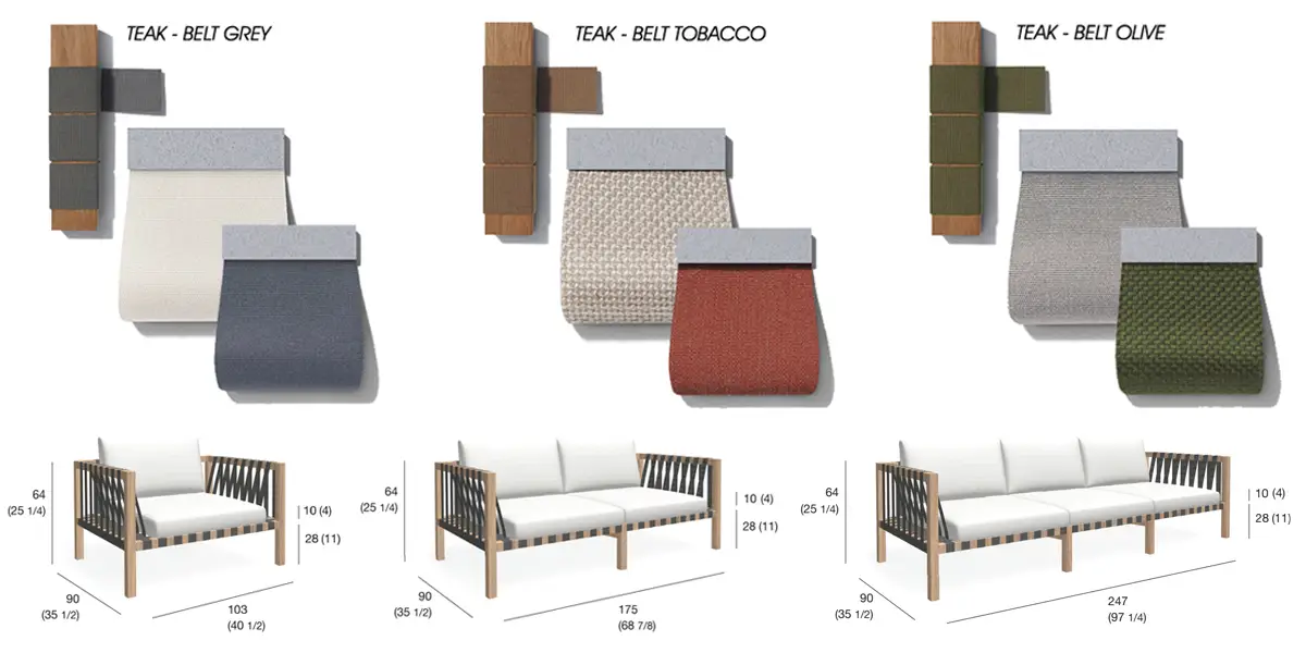 Se vi piace lo stile scelto per il progetto, Mistral è quella che fa per voi. La collezione include un divano, una poltrona e un lettino. La struttura è realizzata in massello di teak e completata da cinghie nei colori grey, tabacco o verde oliva da abbinare a tessuti in diverse tonalità e trame.
