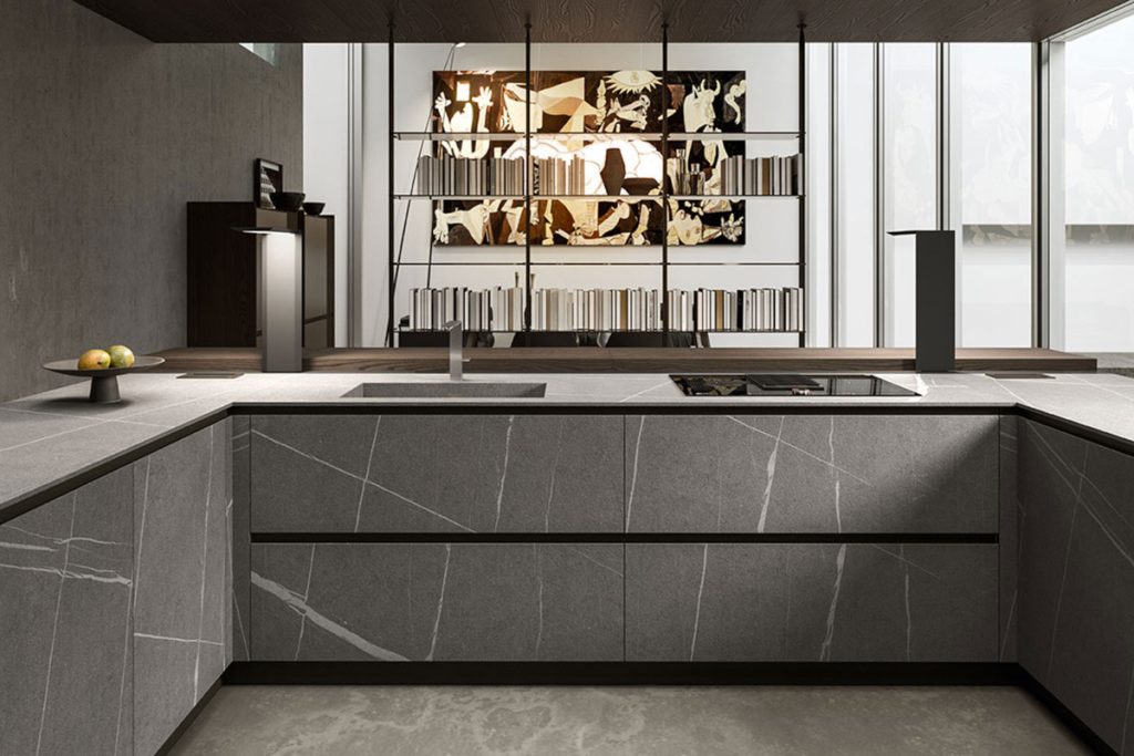 La disposizione con penisola è perfetta per le zone living open space e aiuta a delimitare lo spazio tra cucina e soggiorno. Il frigorifero può essere collocato all’estremità opposta a quella in cui si trova la penisola, piano cottura e lavandino come nelle altre soluzioni possono essere posti su due pareti contigue non troppo lontani tra loro. La penisola può essere completata con sgabelli e rappresentare un angolo per la colazione, l’aperitivo o un pasto veloce e informale.