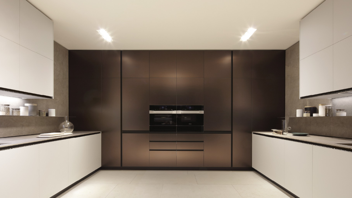 Ideale per piccoli spazi e per piante rettangolari strette e lunghe, la cucina a cambusa è appoggiata su due pareti una frontale all’altra. Lo spazio andrà sfruttato verticalmente, meglio se con ripiani e vani a giorno per evitare l’ingombro delle ante aperte. Stessa cosa per gli elementi di contenimento posti in basso, sono preferibili cassettoni che vani chiusi.