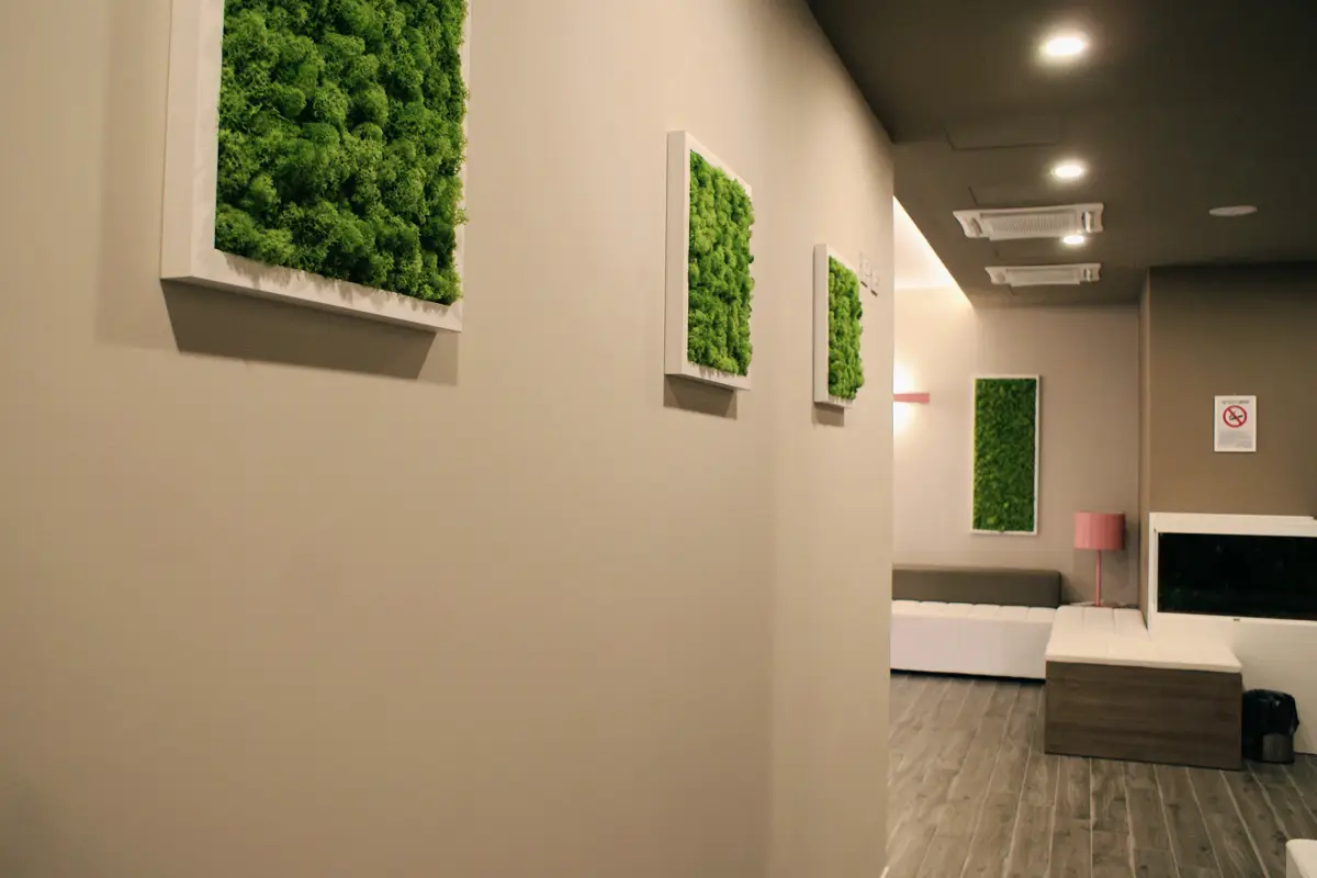 Le pareti sono arricchite da originali quadri in lichene, ultima frontiera dell'interior design. Non solo una scelta estetica, ma anche un modo innovativo di prevenire la formazione di muffe.
