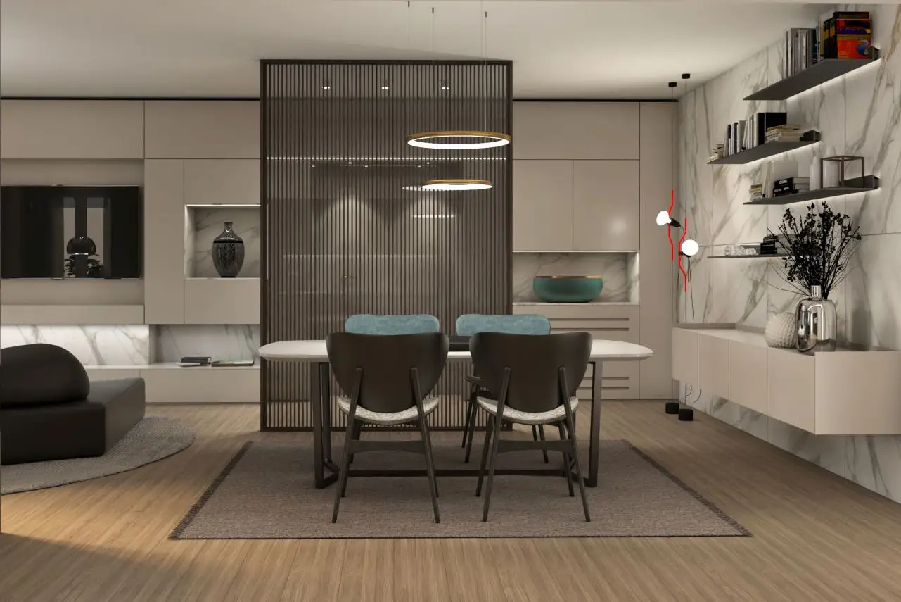 La scelta di adottare il colore nero come tonalità predominante, estendendolo dal divano alla cucina, è emersa come un elemento centrale del progetto. Il proprietario, consapevole dell'importanza di questa decisione, ha richiesto i rendering al fine di valutare con precisione l'impatto del colore sullo spazio abitativo. Poi, per creare un contrasto cromatico suggestivo ed elegante, il marmo bianco è stato scelto per il tavolo da pranzo e per decorare la parete della cucina.