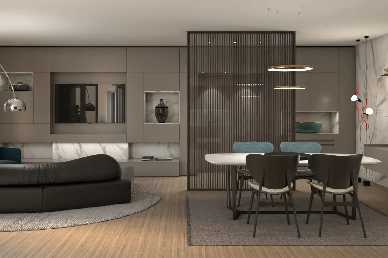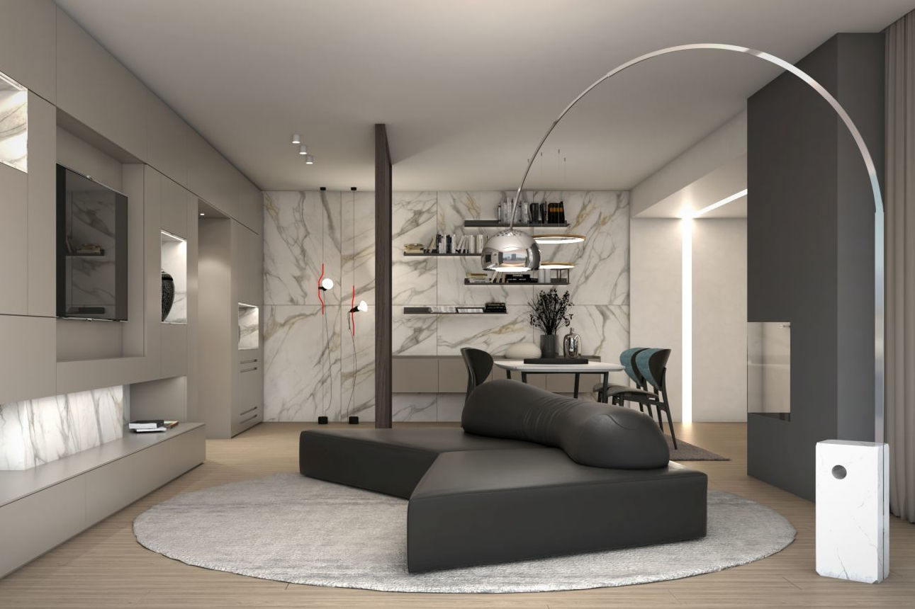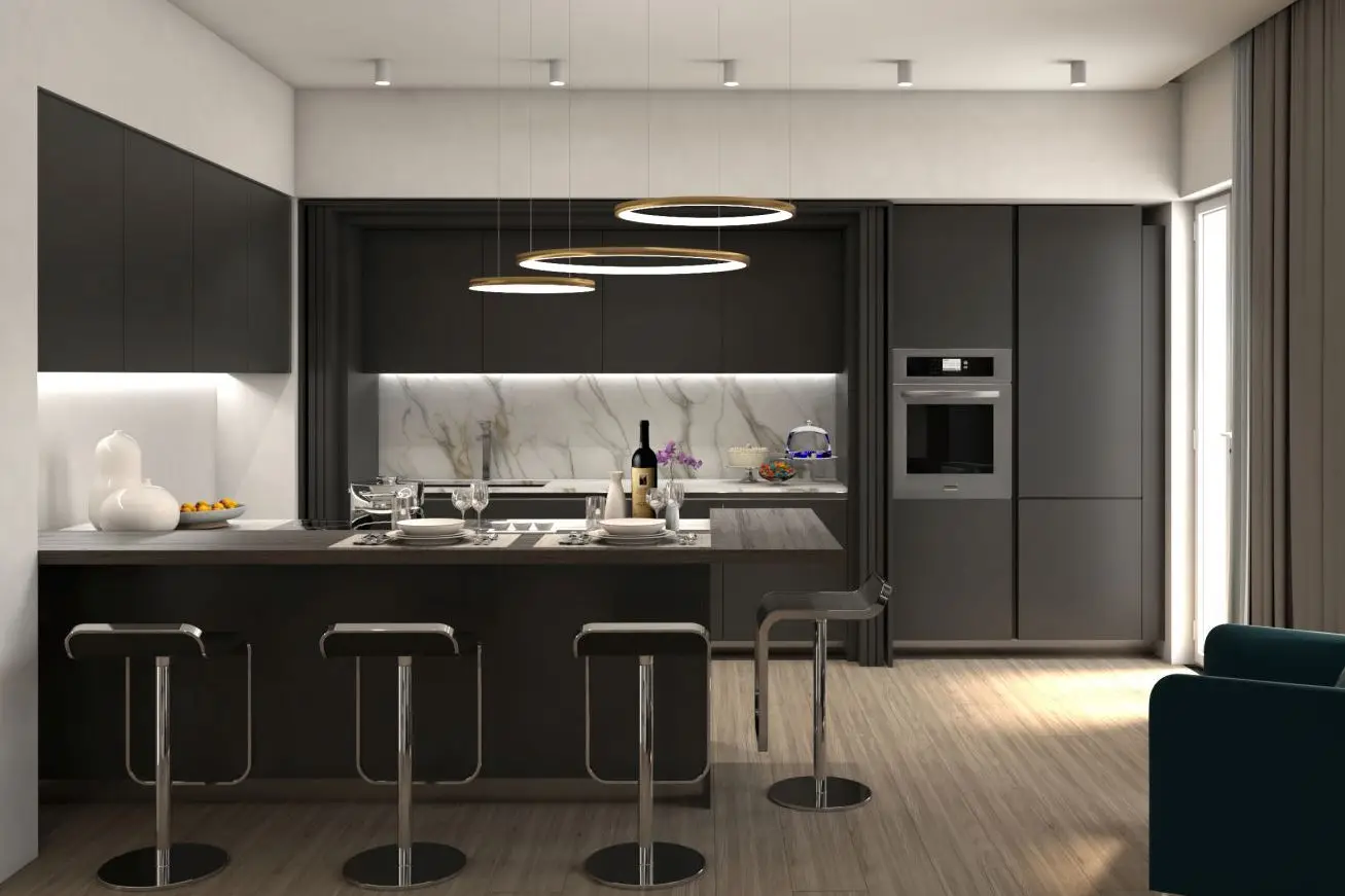 La scelta di adottare il colore nero come tonalità predominante, estendendolo dal divano alla cucina, è emersa come un elemento centrale del progetto. Il proprietario, consapevole dell'importanza di questa decisione, ha richiesto i rendering al fine di valutare con precisione l'impatto del colore sullo spazio abitativo. Poi, per creare un contrasto cromatico suggestivo ed elegante, il marmo bianco è stato scelto per il tavolo da pranzo e per decorare la parete della cucina.