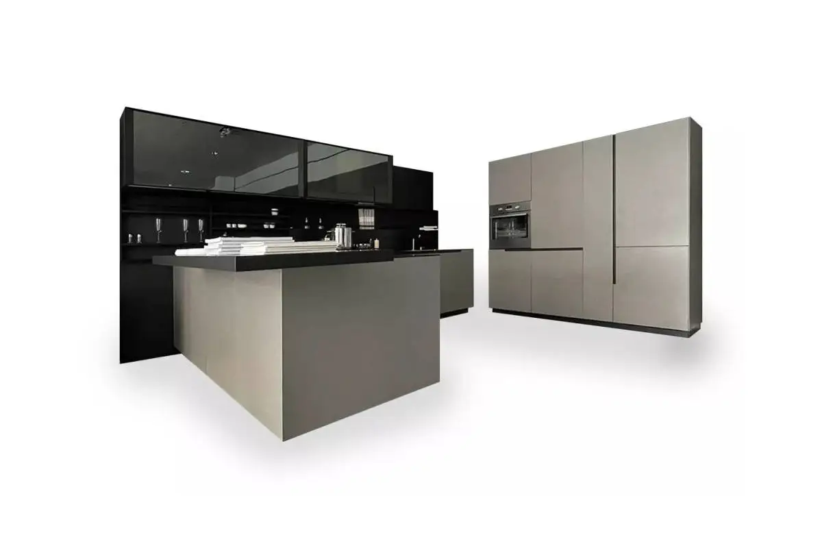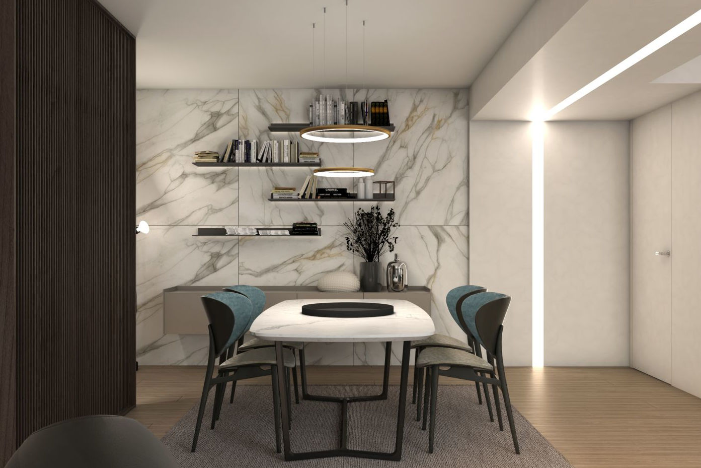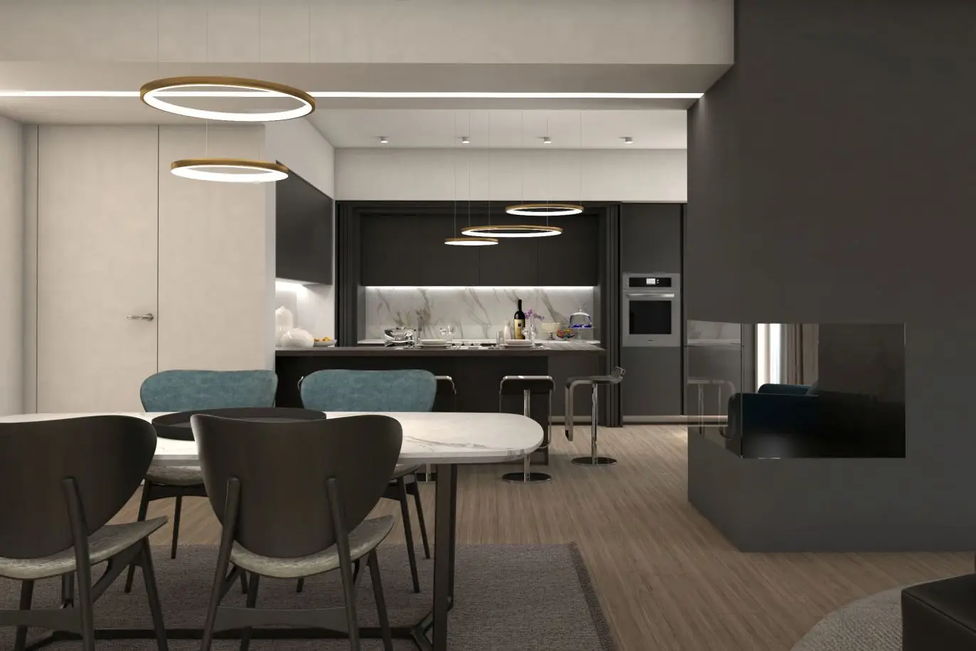 La scelta di adottare il colore nero come tonalità predominante, estendendolo dal divano alla cucina, è emersa come un elemento centrale del progetto. Il proprietario, consapevole dell'importanza di questa decisione, ha richiesto i rendering al fine di valutare con precisione l'impatto del colore sullo spazio abitativo. Poi, per creare un contrasto cromatico suggestivo ed elegante, il marmo bianco è stato scelto per il tavolo da pranzo e per decorare la parete della cucina.