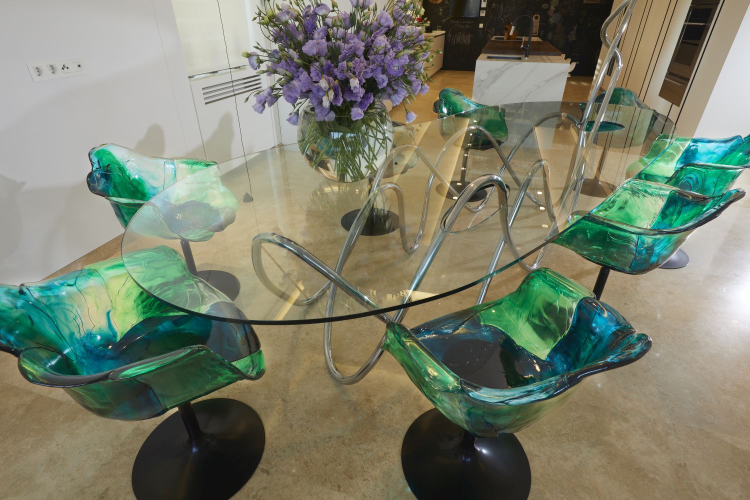 Nella selezione degli arredi, il committente ha dimostrato da subito una predilezione per il designer Jacopo Foggini, scegliendo alcuni dei pezzi iconici disegnati per Edra. Il design audace degli articoli scelti aggiunge colore, sorpresa e originalità alla zona giorno. L'uso creativo di materiali e le forme insolite dei mobili scelti hanno trasformato la residenza in un'opera d'arte viva, dove ogni elemento è una dichiarazione di stile e personalità.