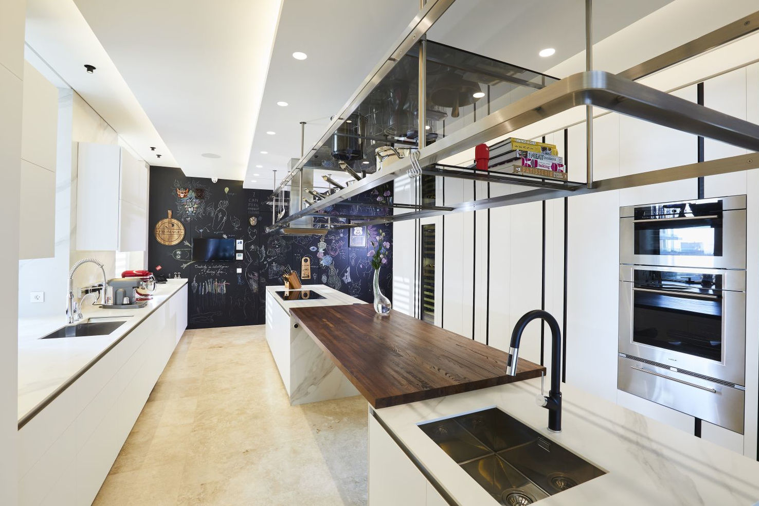 In questo progetto, la combinazione di materiali moderni, come l'acciaio e il policarbonato, con forme sorprendenti e irregolari, ha creato un ambiente che trasuda modernità da ogni dettaglio. La spaziosa cucina diventa il fulcro dell'appartamento, dominando l'ambiente con la sua eleganza monocromatica. Un'esplosione di bianco avvolge lo spazio, creando un'atmosfera luminosa e raffinata.