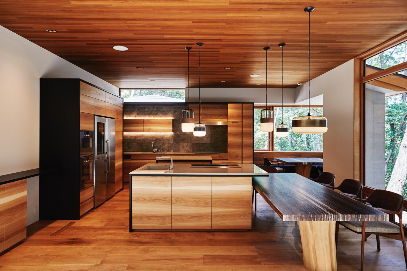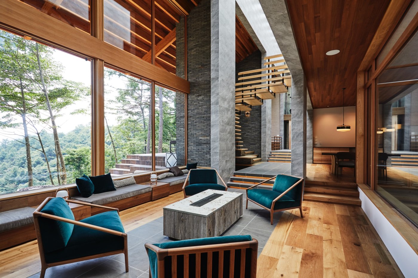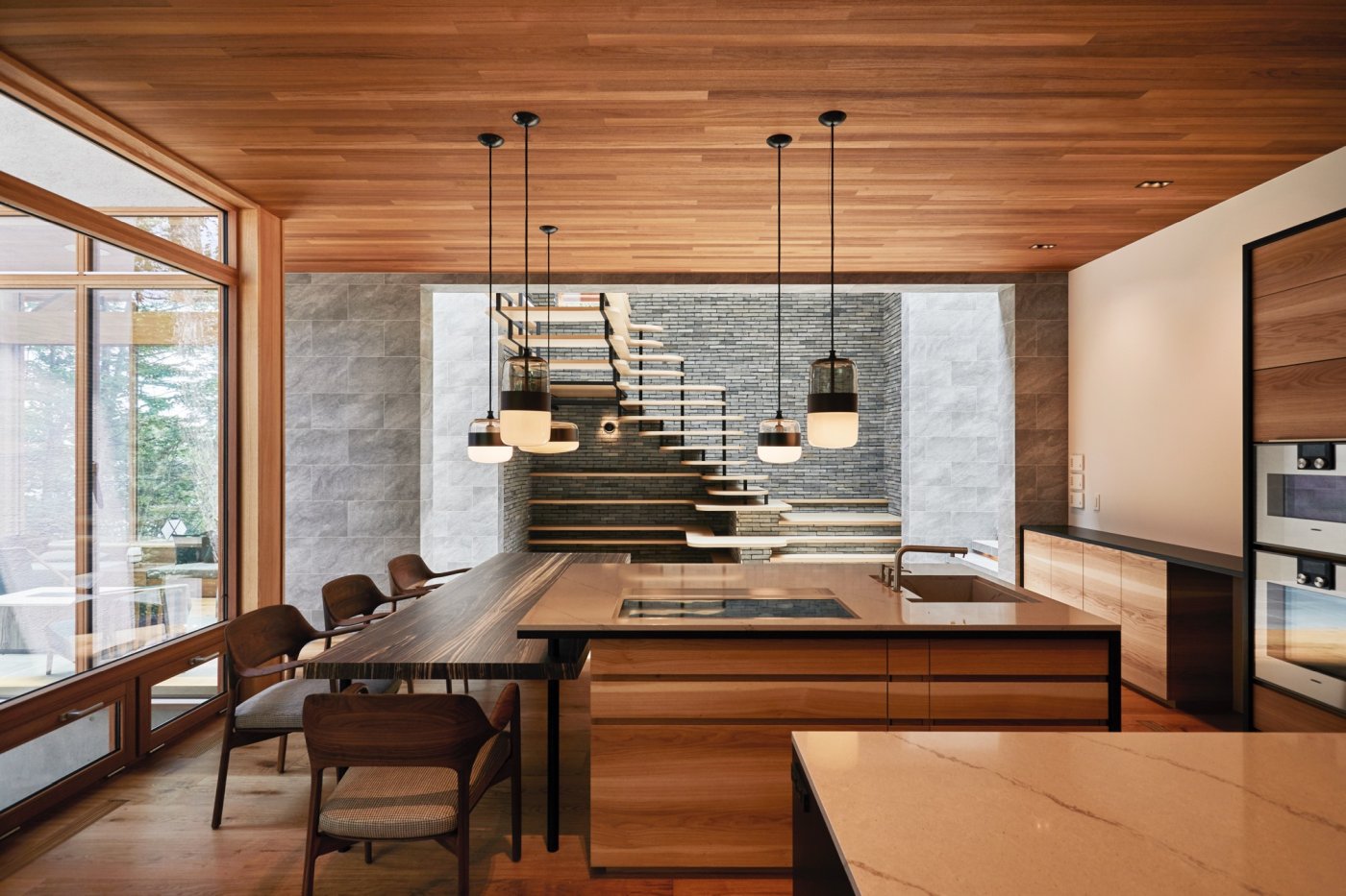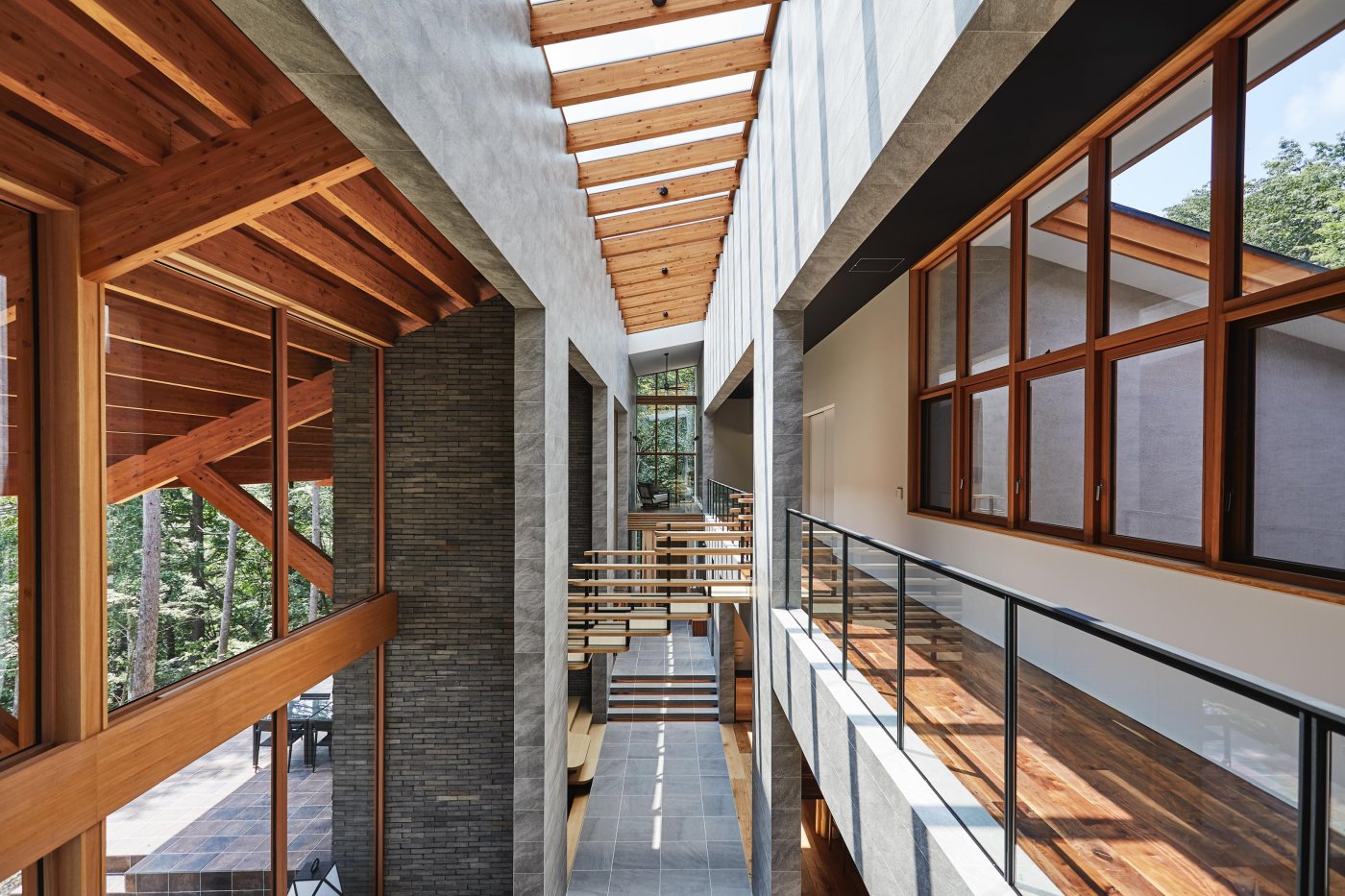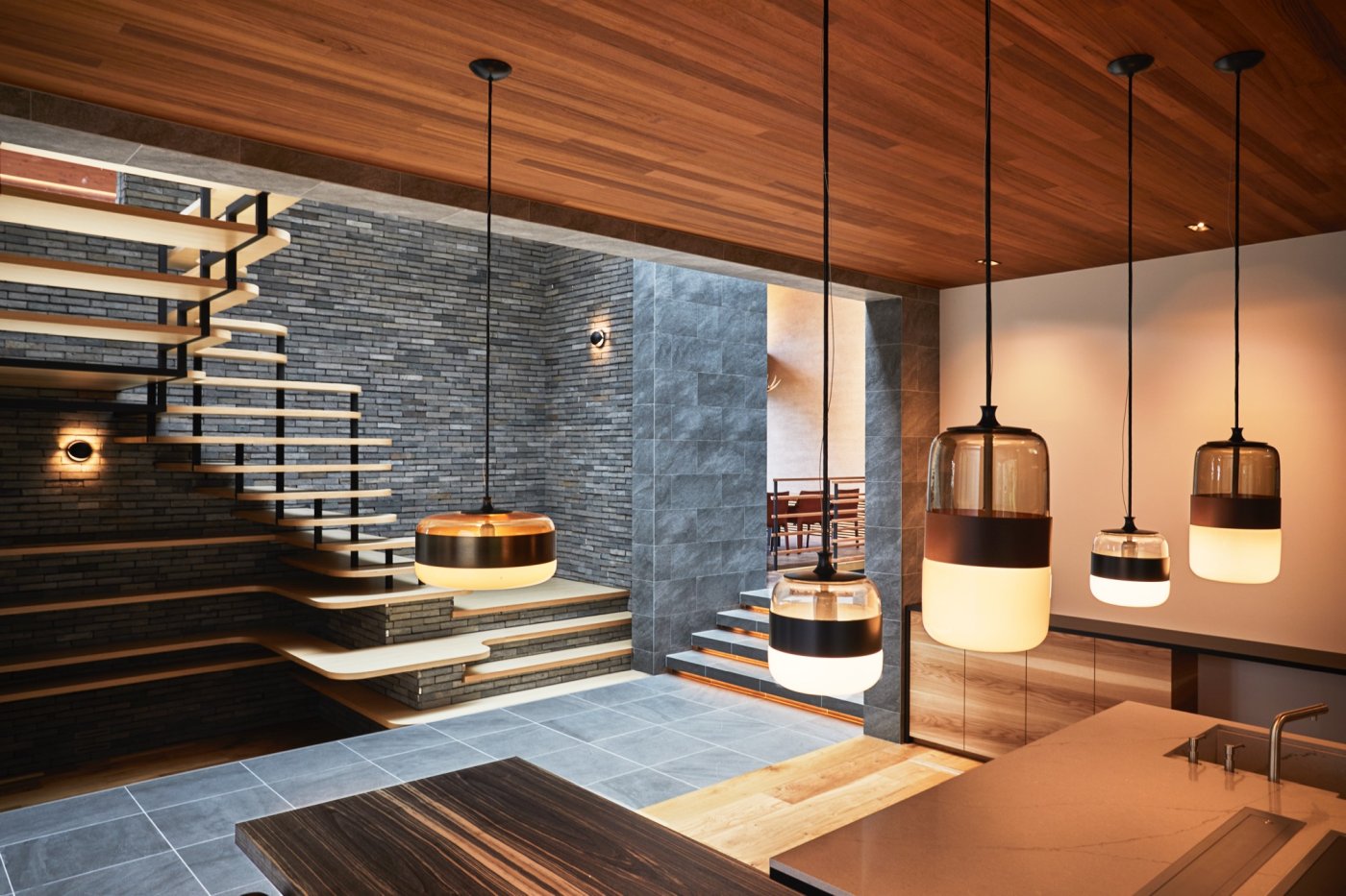 Questo progetto di arredamento è frutto della collaborazione tra Tomassini Arredamenti e il rinomato studio di architettura di Tokyo Funabiki-Architects. Ampi ingressi di luce, grazie a vetrate maestose, creano l'illusione che la stessa natura entri in casa. Soffitti alti, design pulito e giochi sapienti di linee verticali e orizzontali conferiscono un'estetica unica. La scala, leggera e apparentemente fluttuante, ruba la scena, diventando l'elemento architettonico distintivo di questa villa.