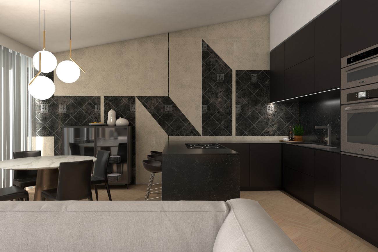 In un ambiente che combinava cucina e living in un unico spazio, la scelta e la disposizione degli arredi ha assunto un ruolo di primaria importanza. Il cliente era in bilico tra diverse opzioni cromatiche: la cucina, con il suo predominante colore nero, sembrava inizialmente audace, ma ha trovato il suo equilibrio quando accostata ad un sofisticato divano bianco ed un elegante tavolo con piano in ceramica.