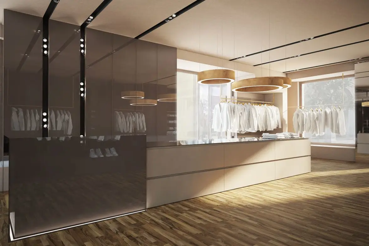Il negozio presenta due vetrine, una che si affaccia sulla piazza principale del centro abitato e l'altra su una via laterale. Al fine di ottimizzare lo spazio, è stato adottato un approccio strategico posizionando le appenderie sulla vetrina laterale. La progettazione dell'illuminazione a soffitto è stata attentamente studiata per influenzare positivamente la percezione dello spazio, creando una sensazione di ampiezza. Con lo stesso obiettivo, sono stati integrati nel progetto elementi strutturali e decorativi in vetro e superfici lucide per massimizzare la luminosità dell'ambiente.