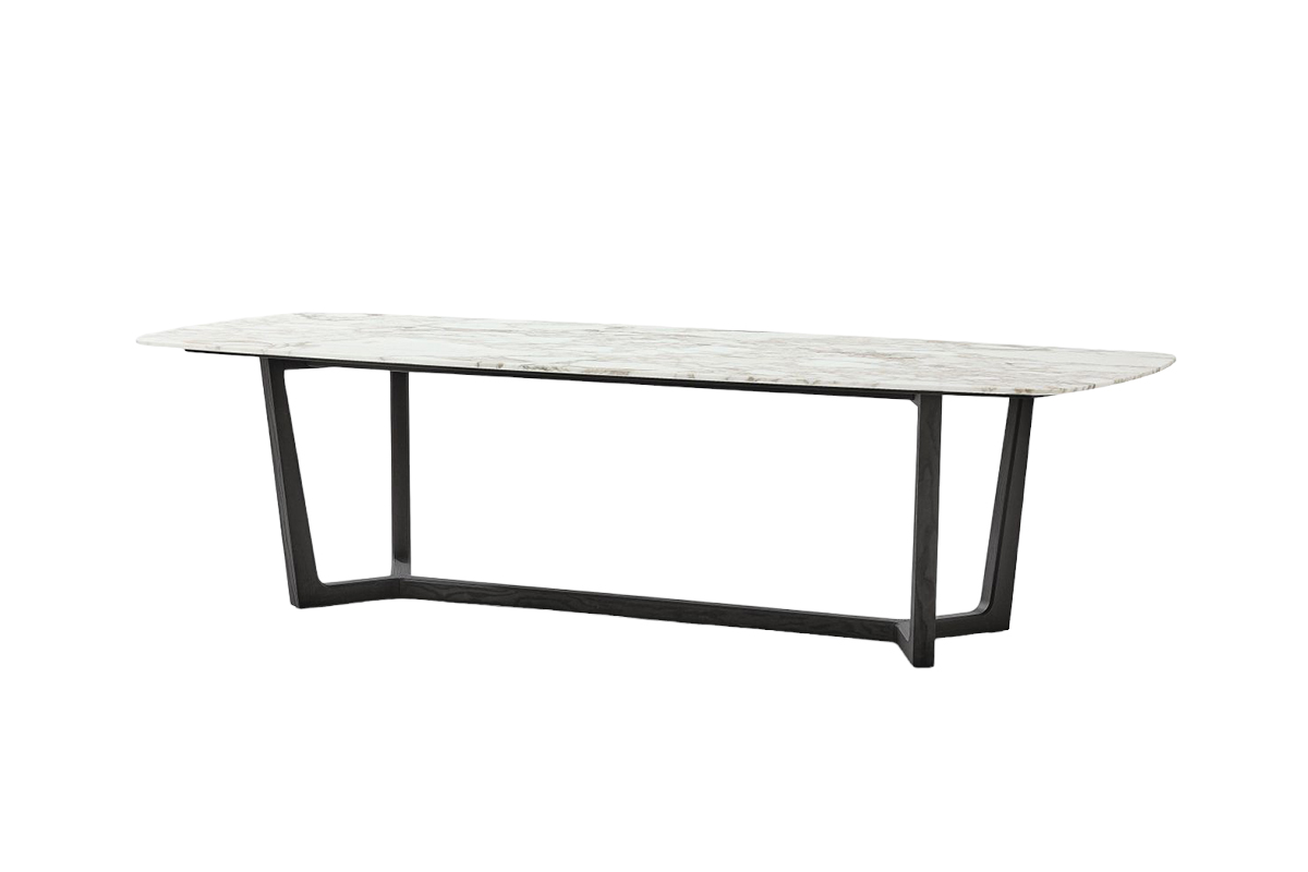 Un unico ampio ambiente ospita sia il soggiorno che la cucina: il marmo è stato scelto sia per il piano del tavolo da pranzo che per i tavolini da salotto, ma in diverse finiture: Calacatta e Emperador. A completare l'arredamento, una moderna e dinamica libreria Airport realizzata su misura e fissata a muro. Tutti gli altri complementi di arredo, dalla zona giorno alle camere da letto, sono firmati Poliform.