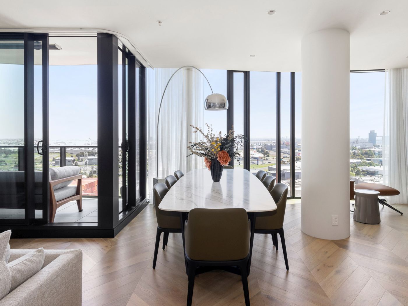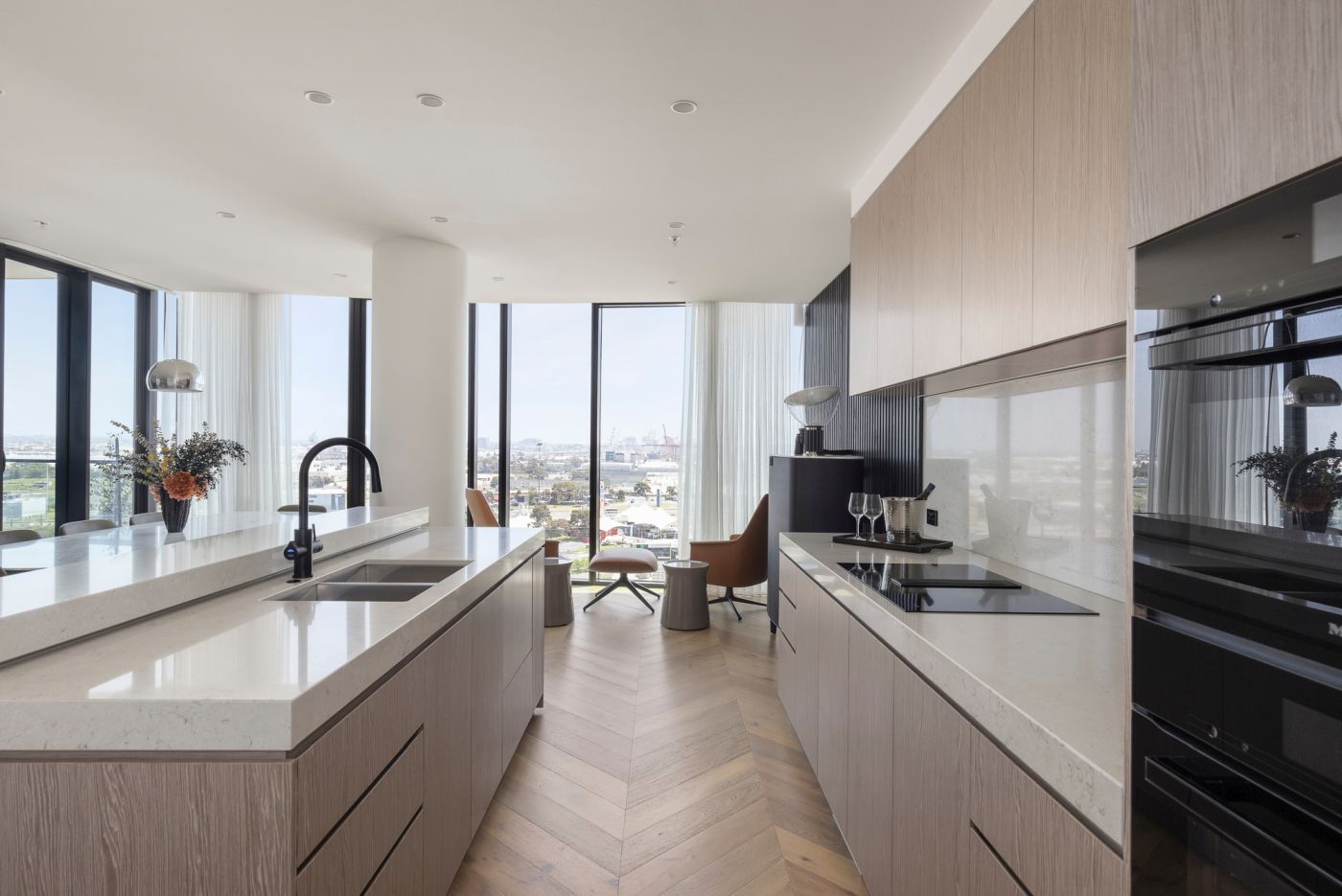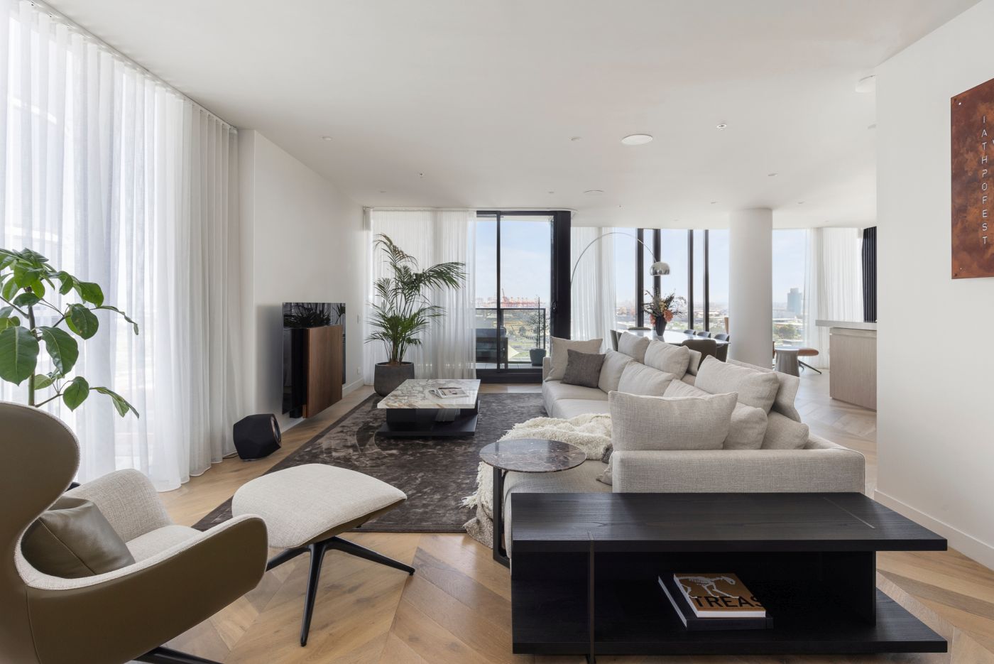Tomassini Arredamenti ha avuto l'onore di realizzare gli interni di questo raffinato appartamento situato a Melbourne. Una palette di colori tenui ed una grande vetrata illuminano il vasto living, che vede come protagonista il divano modulare Bristol di Poliform. Le pareti bianche e un caldo parquet fungono da tela perfetta per valorizzare tutti gli altri arredi, anch'essi caratterizzati da colori eleganti e neutri.