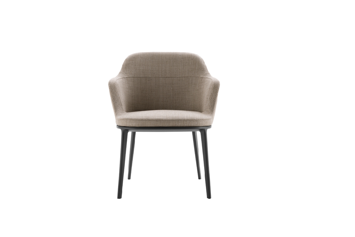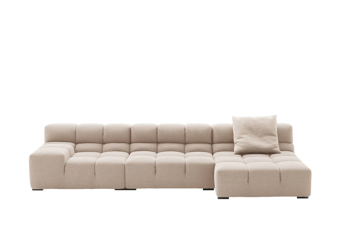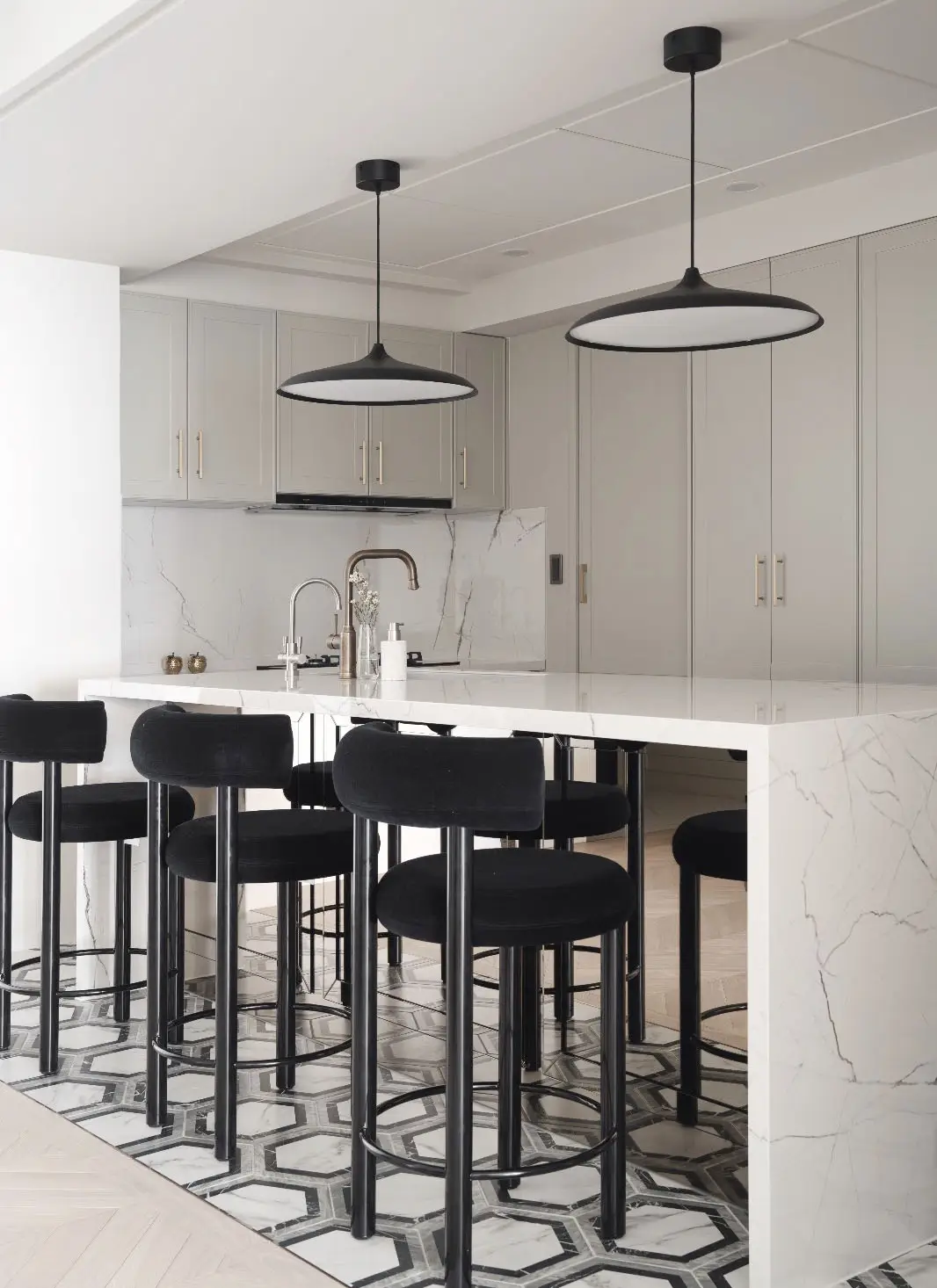 La qualità del Made in Italy, la purezza delle linee, e l'ordine degli elementi di arredo rendono questo appartamento un capolavoro di design. In tutto l'appartamento emerge un intrigante ma equilibrato contrasto con il colore nero: dal marmo Marquinia del tavolo Allure O', al velluto degli sgabelli di Tom Dixton, passando altri elementi decorativi. Nel soggiorno, il divano Tufty-Time '15 di B&B Italia si distingue per il profilo discreto ma elegante.