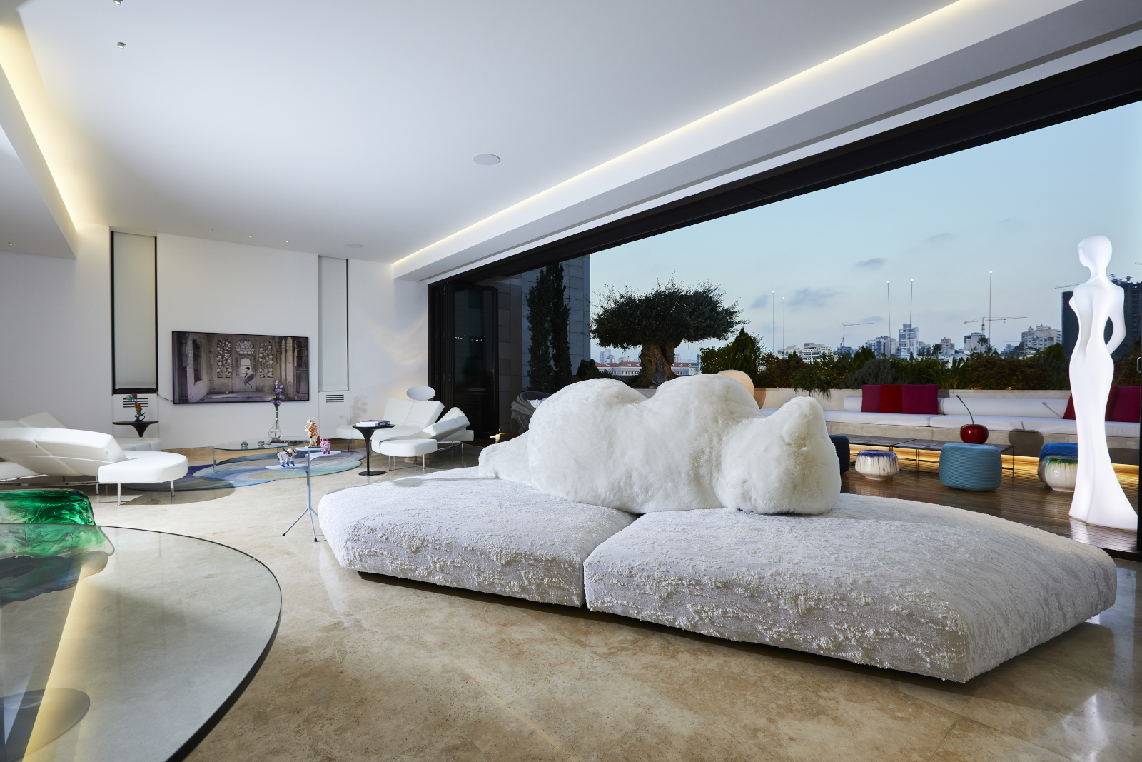 L'ampio living è il fulcro indiscusso dell'abitazione: qui domina una straordinaria vetrata che si apre sul terrazzo con vista panoramica sul porto di Beirut. Il bianco e il blu, in tutte le sue sfumature, sono i colori predominanti: regnano sovrani sia all'interno che all'esterno dell'abitazione. Nell'area outdoor infatti le sedute e i tavolini si abbinano in modo armonioso all'arredamento interno, creando una vincente continuità tra i vari spazi abitativi.