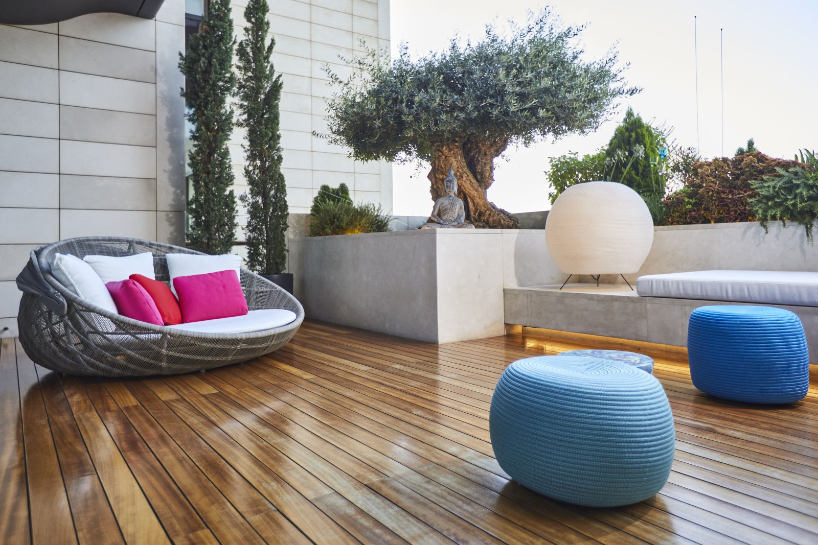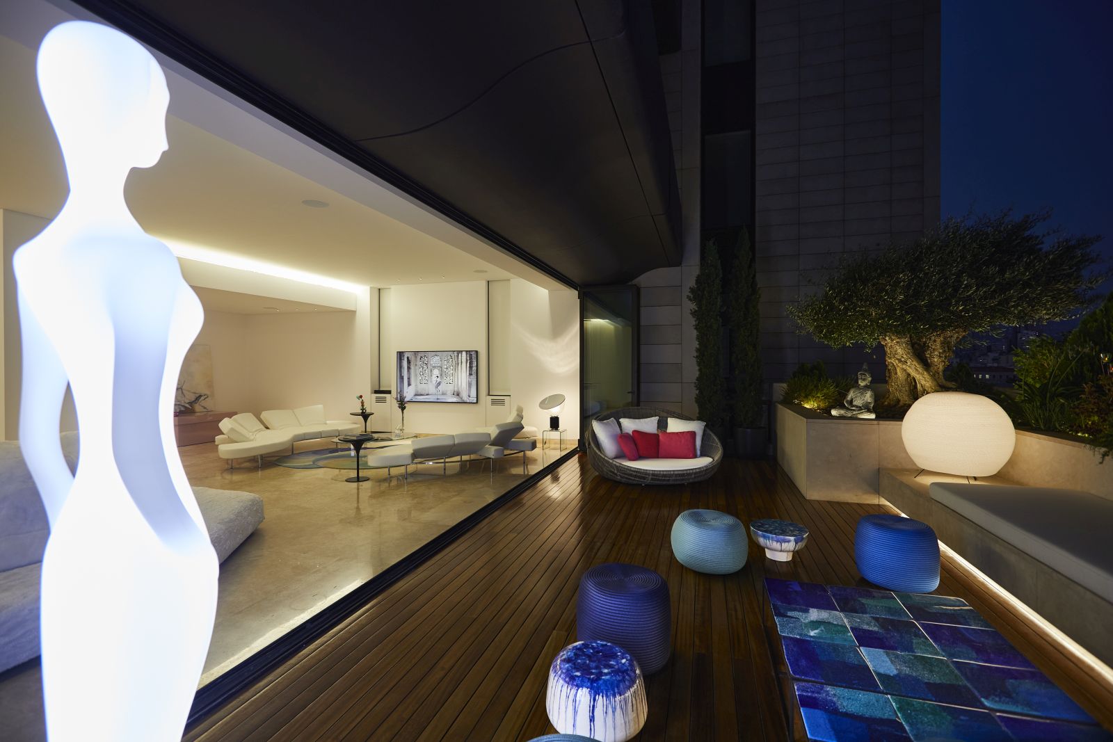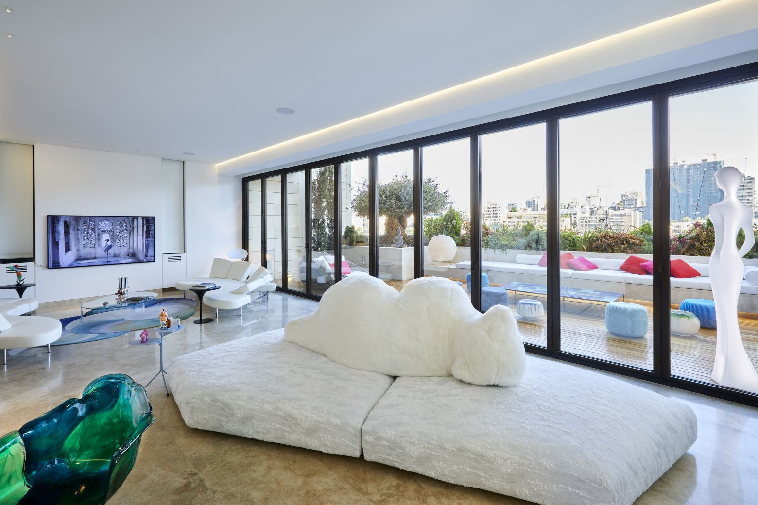 L'ampio living è il fulcro indiscusso dell'abitazione: qui domina una straordinaria vetrata che si apre sul terrazzo con vista panoramica sul porto di Beirut. Il bianco e il blu, in tutte le sue sfumature, sono i colori predominanti: regnano sovrani sia all'interno che all'esterno dell'abitazione. Nell'area outdoor infatti le sedute e i tavolini si abbinano in modo armonioso all'arredamento interno, creando una vincente continuità tra i vari spazi abitativi.