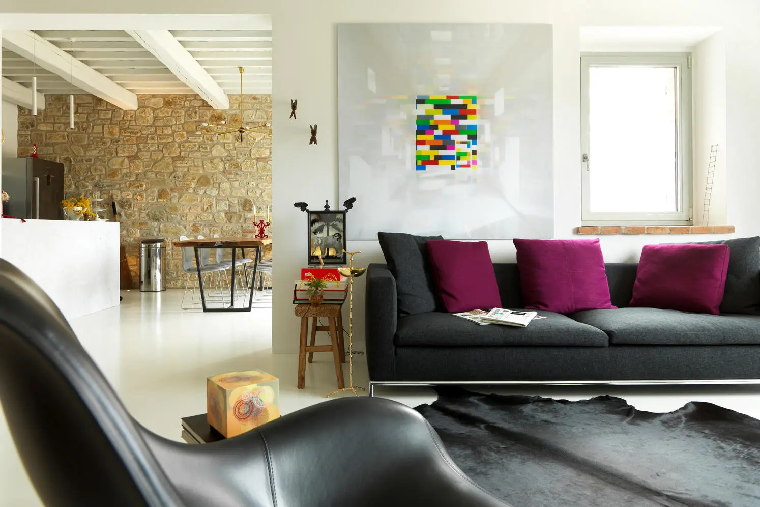 Le sedute di B&B Italia sono protagoniste dell'ampio ed accogliente living, illuminato dalla lampada di Foscarini. Le inconfondibili poltrone di Fritz Hansen collegano la zona relax alla luminosa sala da pranzo, dove le moderne sedie di Cappellini contrastano con la tradizionale parete in pietra. Per le camere da letto sono stati scelti i letti di Zanotta.