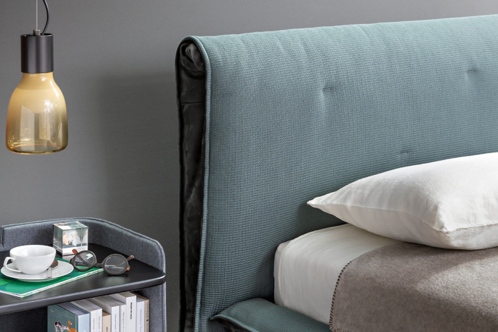 La famiglia di imbottiti Saddle, disegnata da Giuseppe Viganò per Bonaldo è composta da letto, panca, poltrona e divano. Gli elementi distintivi che accomunano tutti i prodotti della collezione sono i lembi di schienali, braccioli, testate e giroletti che ripiegandosi su sé stessi ricordano la forma di una sella. Il letto Saddle bed è disponibile anche con contenitore.