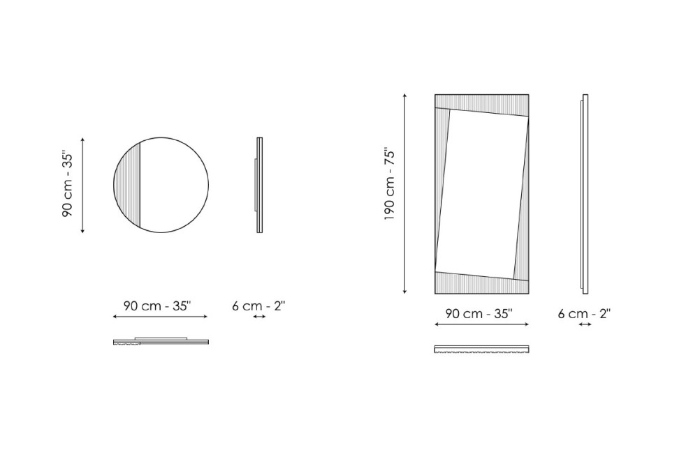 Questo specchio di design è offerto in due opzioni dimensionali per adattarsi alle diverse preferenze e ai vari contesti. La versione rettangolare misura cm. 90x190h, perfetta per creare un'illuminazione verticale e riflettere l'ambiente circostante in modo dinamico. Invece, la versione tondeggiante ha un diametro di cm. Ø90, ideale per creare un punto focale arrotondato e aggiungere un tocco di eleganza e armonia all'ambiente.