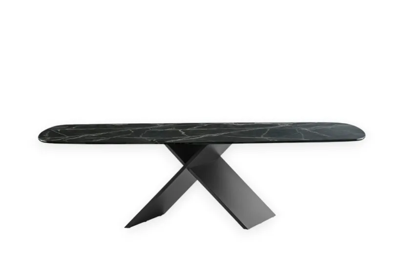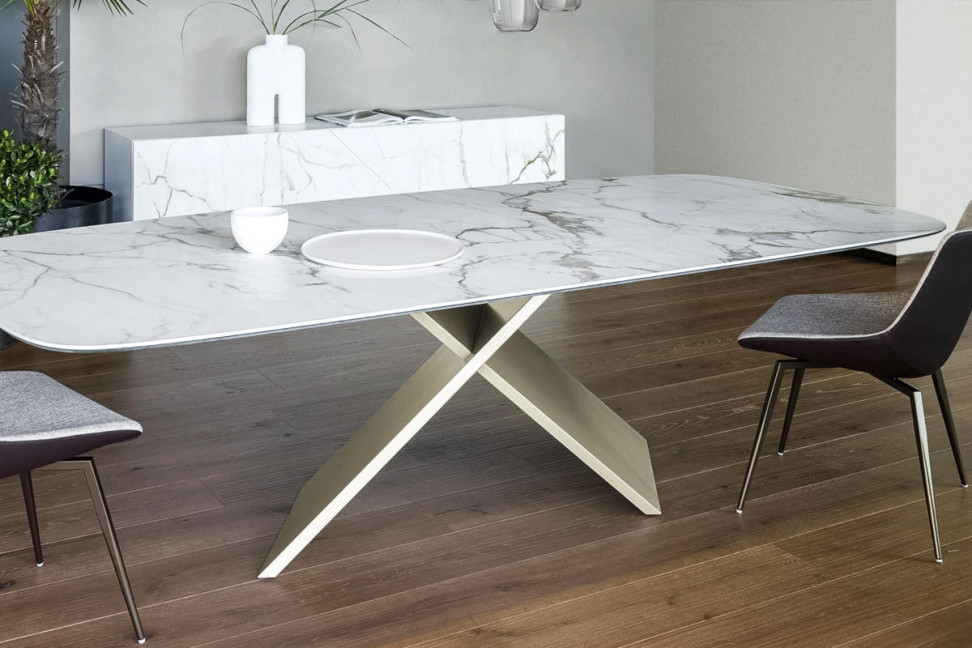 Il tavolo da pranzo AX di Bonaldo, progettato dall'italiano Gino Carollo, è un tavolo da pranzo sia fisso che estensibile caratterizzato da una base a forma di X in metallo, che si fa apprezzare per il raffinato contrasto materico tra piano e struttura.