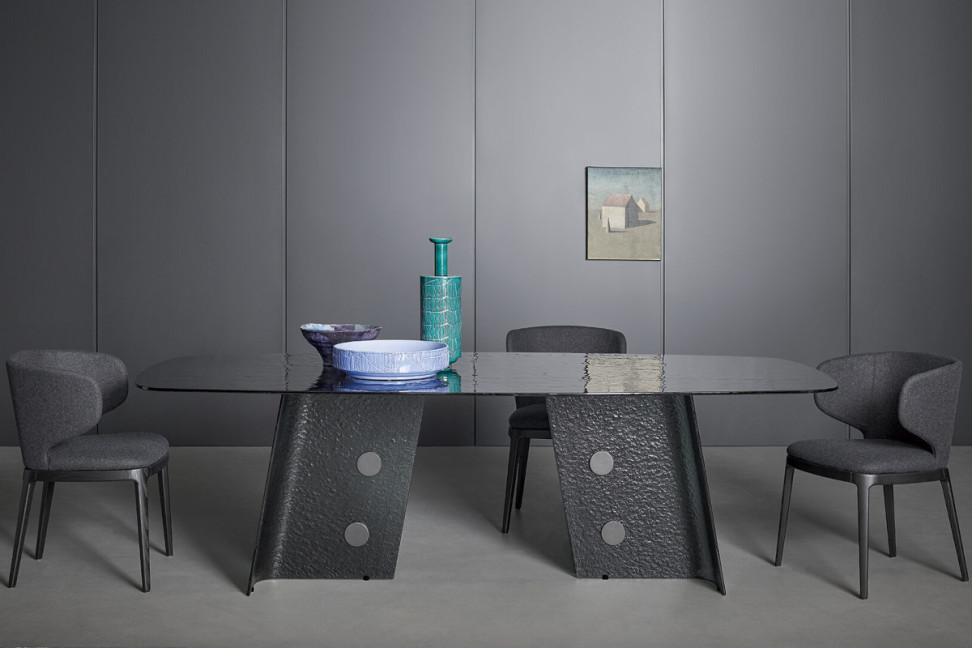 Nato dal progetto di Twins Design per Bonaldo, il tavolo Botón è pensato per essere posizionato al centro della stanza, diventando il punto focale dell'intero ambiente. Il materiale principale utilizzato per la realizzazione di questo tavolo di design è il vetro fuso, una scelta che enfatizza l'eleganza e la raffinatezza del prodotto. Il vetro fuso temperato è noto per la sua resistenza e durabilità, oltre che per la sua bellezza intrinseca che conferisce al tavolo un aspetto sofisticato e allo stesso tempo moderno, rendendolo il protagonista indiscusso della sala da pranzo. Il piano del tavolo Botón presenta un design lineare, con una forma a botte che aggiunge un tocco di originalità. Le due gambe che compongono la base del tavolo sono costituite da una coppia di fogli di vetro che si estendono verso l'esterno, creando un angolo che conferisce stabilità e solidità alla struttura complessiva.