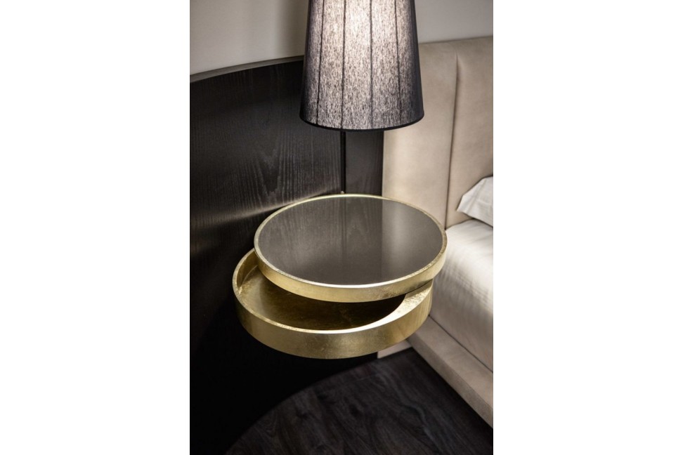 Mirage è l'elegante letto proposto dal marchio Made in Italy Cantori. Elemento caratterizzante di questo letto è la testata, ampia e leggermente curva, che lo avvolge in un ideale abbraccio e contribuisce a rendere accogliente questo spazio. La struttura della testata è in legno ed è arricchita nella parte centrale da un'imbottitura rivestita in tessuto o pelle. Anche il giro-letto è imbottito e rivestito, mentre i piedini sono in metallo. Il letto Mirage è dotato di due piani inseriti nella testata, che grazie alla rotazione rappresentano due comodi elementi d'appoggio.