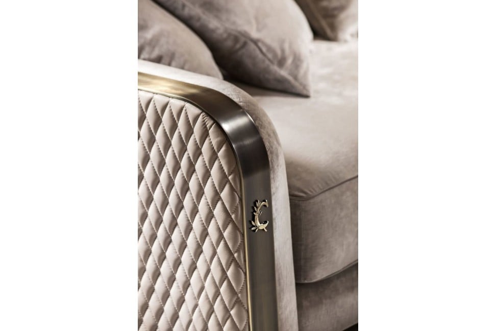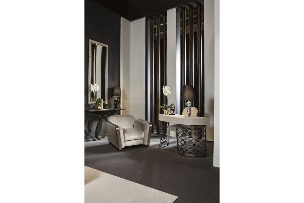 Voyage è la poltrona dal gusto vintage proposta dal marchio Cantori. Questa poltrona è caratterizzata dall'importante segno grafico dei profili in bronzo, impreziositi nei braccioli con la decorazione dell'azienda, e dalla trapuntatura presente sul rivestimento esterno. La poltrona Voyage è proposta con rivestimento in tessuto.