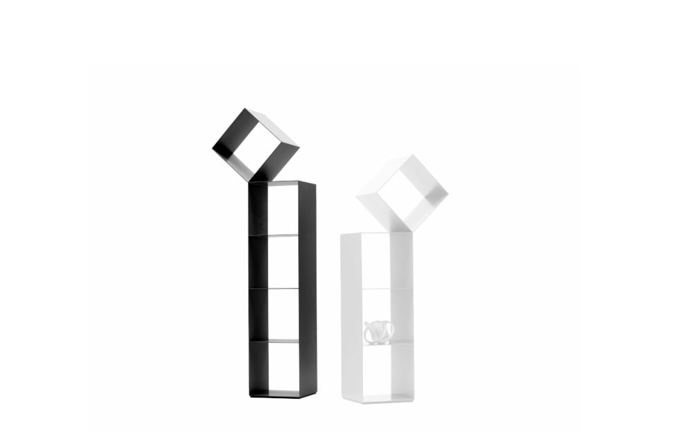 Le librerie Drop sono realizzate in lamiera di metallo tagliata al laser e laccata opaco in una gamma di di toni che vanno dal bianco, al fango e nero; la versione più bassa può essere utilizzata anche nella zona notte fungendo da sofisticato comodino.