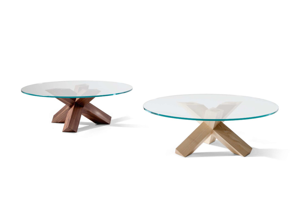 La base del tavolino La Rotonda di Cassina è formata da tre elementi in legno a sezione quadrata che si intersecano perpendicolarmente per andare a sostenere il piano. Il basamento del tavolino La Rotonda è disponibile in una vasta gamma di legno, mentre il piano può esser in legno, cristallo o varie tipologie di marmo.