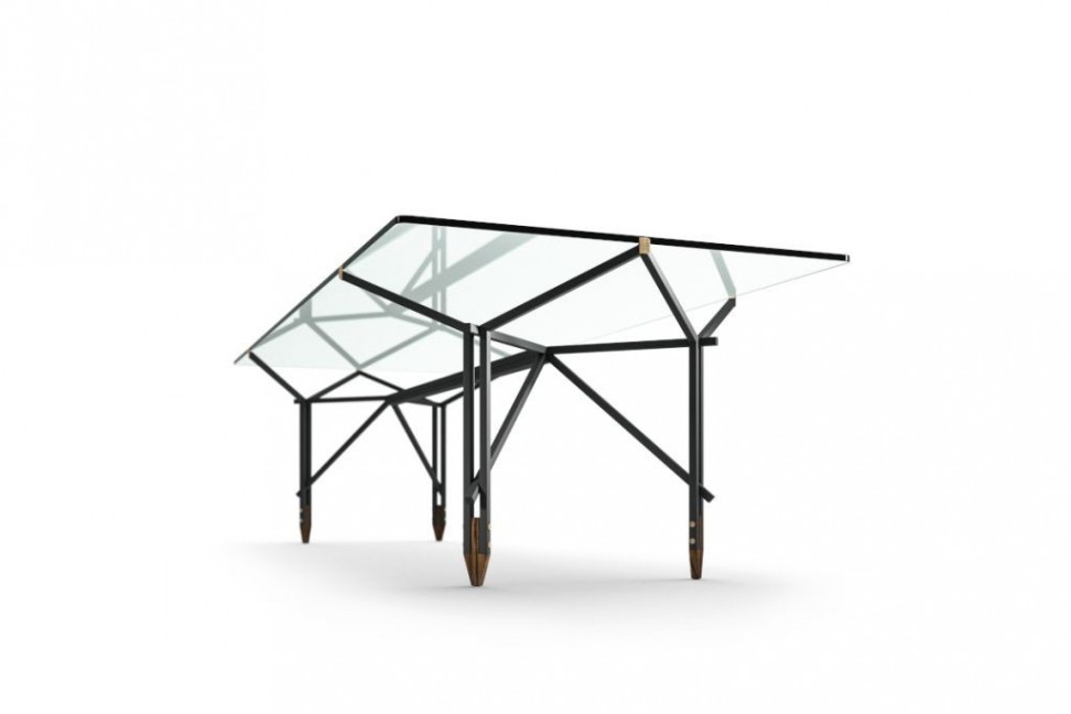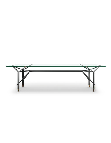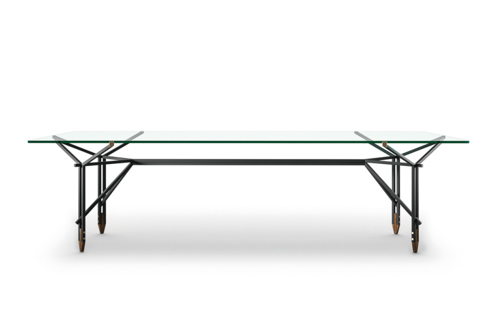 Il tavolo Olimpino presenta una struttura, snella e riconoscibile, realizzata in tubolare di metallo a sezione quadrata che si sviluppa attraverso due coppie di montanti a “Y”. Le braccia interne del tavolo Olimpino convergono sotto le testate del piano in vetro monolitico temperato, mentre quelle esterne lo bloccano lateralmente, grazie a fermagli in ottone. Le gambe sono unite da una doppia traversa in metallo che si apre a formare una duplice “V”. Le viti in ottone e i piedini in legno massello, notoriamente a forma di freccia, completano e impreziosiscono il design.