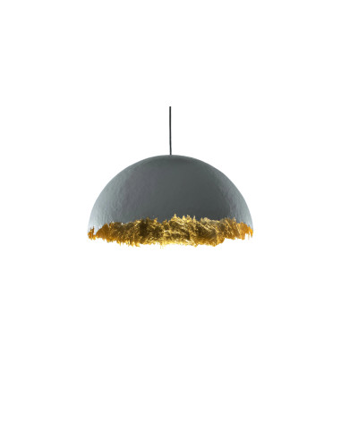 Enzo Catellani, designer e fondatore dell'omonima azienda, scopre la versatilità e robustezza della vetroresina che diventa così il materiale principale e protagonista della sorprendende collezione Postkrisi. La lampada a sospensione Postkrisi 49 si distingue per la sua struttura semisferica dai bordi irregolari e frastagliati che riporta alla mente l'immagine della perfettà metà di un guscio rotto. Disponibile in due diverse dimensioni e con un rivestimento interno in foglia oro o argento, Postkrisi 49 colpisce per i particolari giochi di ombre che scaturiscono dall'impatto della luce Led posta all'interno della struttura con la superficie in vetroresina.