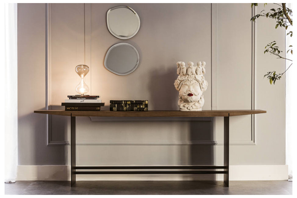 La consolle Trevi, disegnata dallo studio Kronos, è composta da poche e semplici forme geometriche che combinate insieme creano un elemento di arredo dal design raffinato e versatile. La consolle Trevi si distingue per il sottile piano in legno sorretto da una leggera struttura in metallo. Cattelan realizza il piano in noce Canaletto o rovere bruciato, mentre per la struttura è possibile scegliere fra acciaio verniciato goffrato titanio o nero.