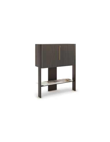 Per conferire un ulteriore tocco di classe e prestigio, il piano inferiore a giorno è realizzato in ceramica effetto marmo, un materiale che ormai rappresenta la firma stilistica e la garanzia di autenticità dei prodotti Cattelan Italia, disponibile nei colori Portoro opaco o Corcovado. La ceramica conferisce alla madia un aspetto lussuoso e una superficie resistente, creando un contrasto visivo affascinante con il calore del legno. L'anta scorrevole è disponibile in noce Canaletto oppure rovere bruciato ed ha un meccanismo a controllo di gravità. La struttura in legno della madia Cremona è realizzabile in verniciato goffrato bronzo e noce Canaletto o rovere bruciato con particolari in acciaio verniciato ottone.